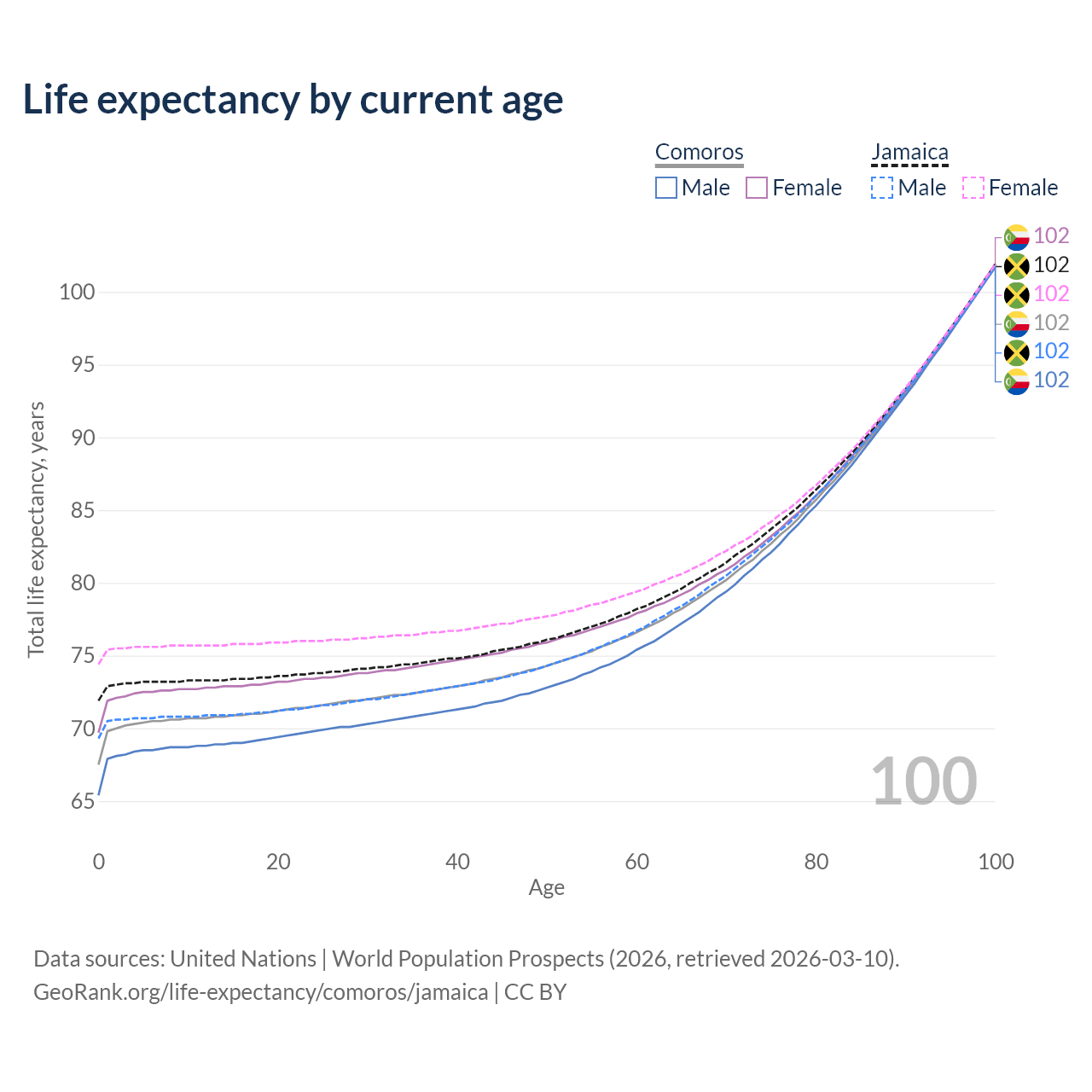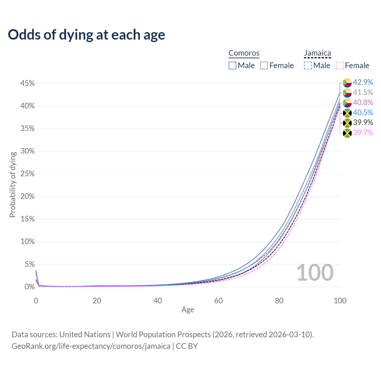 This life expectancy calculator shows the odds of living to 100, 95, 90, and below based on current age for both males and females in Comoros and Jamaica, along with mean and median age of death. The calculations are based on the 2026 life tables (actuarial tables) from the UN World Population Prospects.