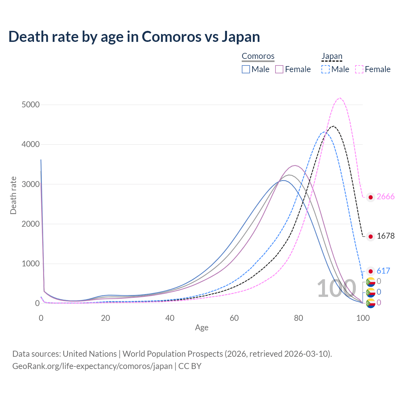 In Comoros, the most common age of death is 0, compared to 91 in Japan. The median age of death is 72.9 in Comoros and 88.1 in Japan, meaning only half of each cohort is expected to live past that age.