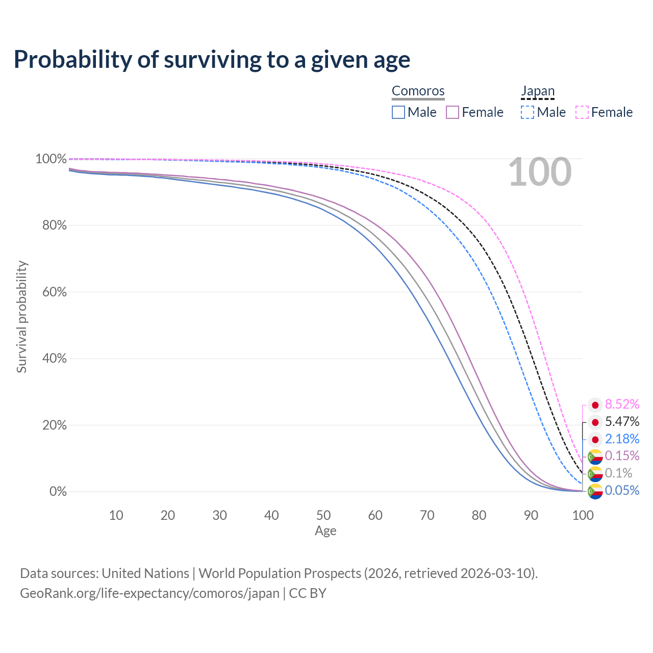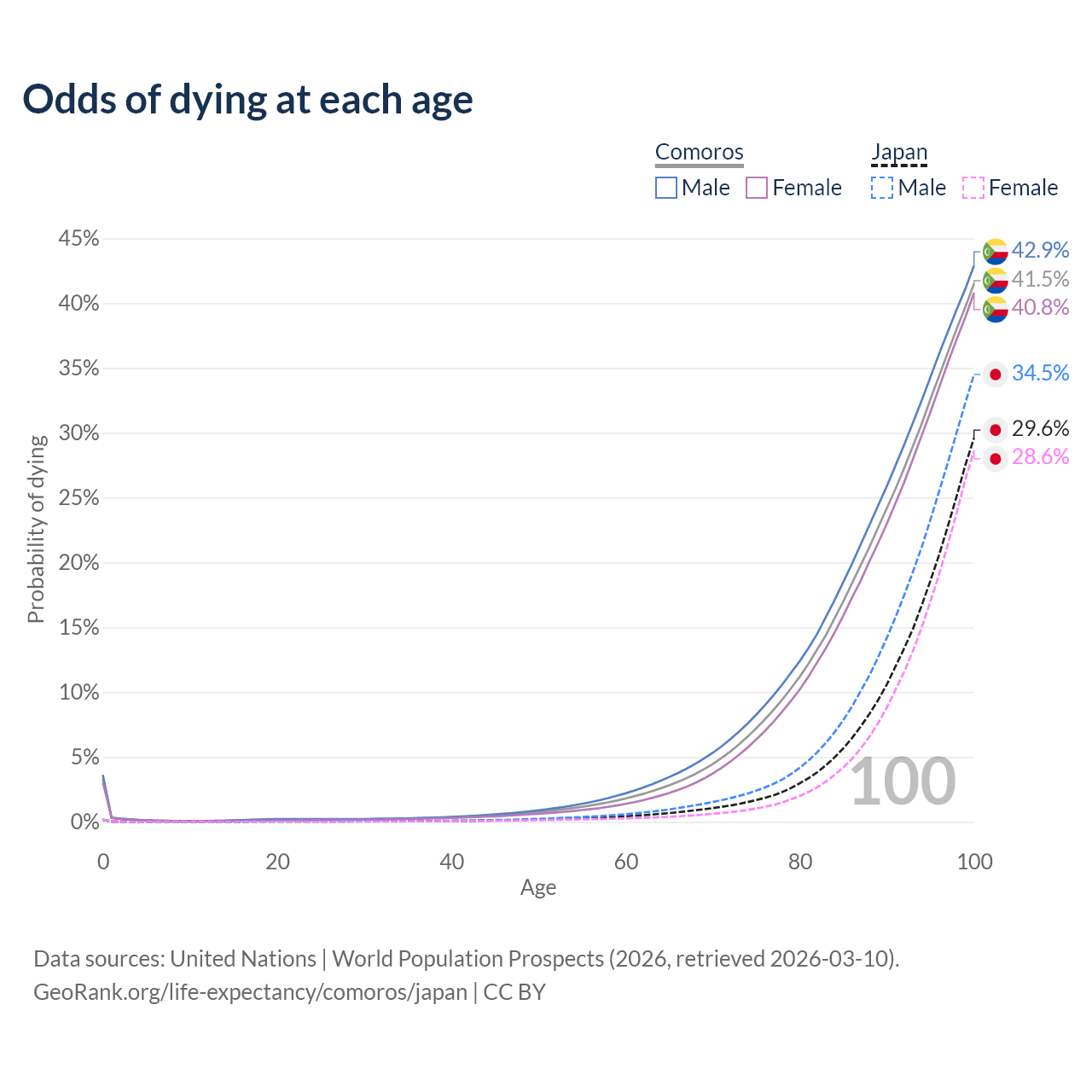 This life expectancy calculator shows the odds of living to 100, 95, 90, and below based on current age for both males and females in Comoros and Japan, along with mean and median age of death. The calculations are based on the 2026 life tables (actuarial tables) from the UN World Population Prospects.