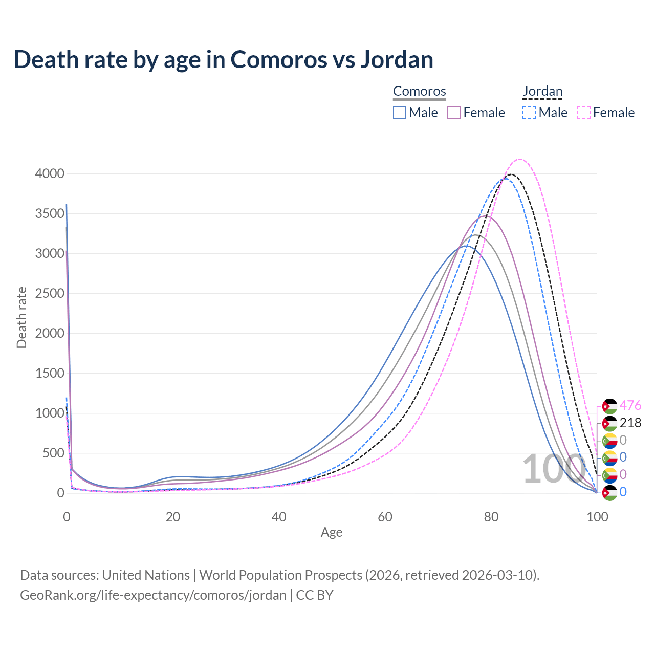 In Comoros, the most common age of death is 0, compared to 84 in Jordan. The median age of death is 72.9 in Comoros and 81.3 in Jordan, meaning only half of each cohort is expected to live past that age.