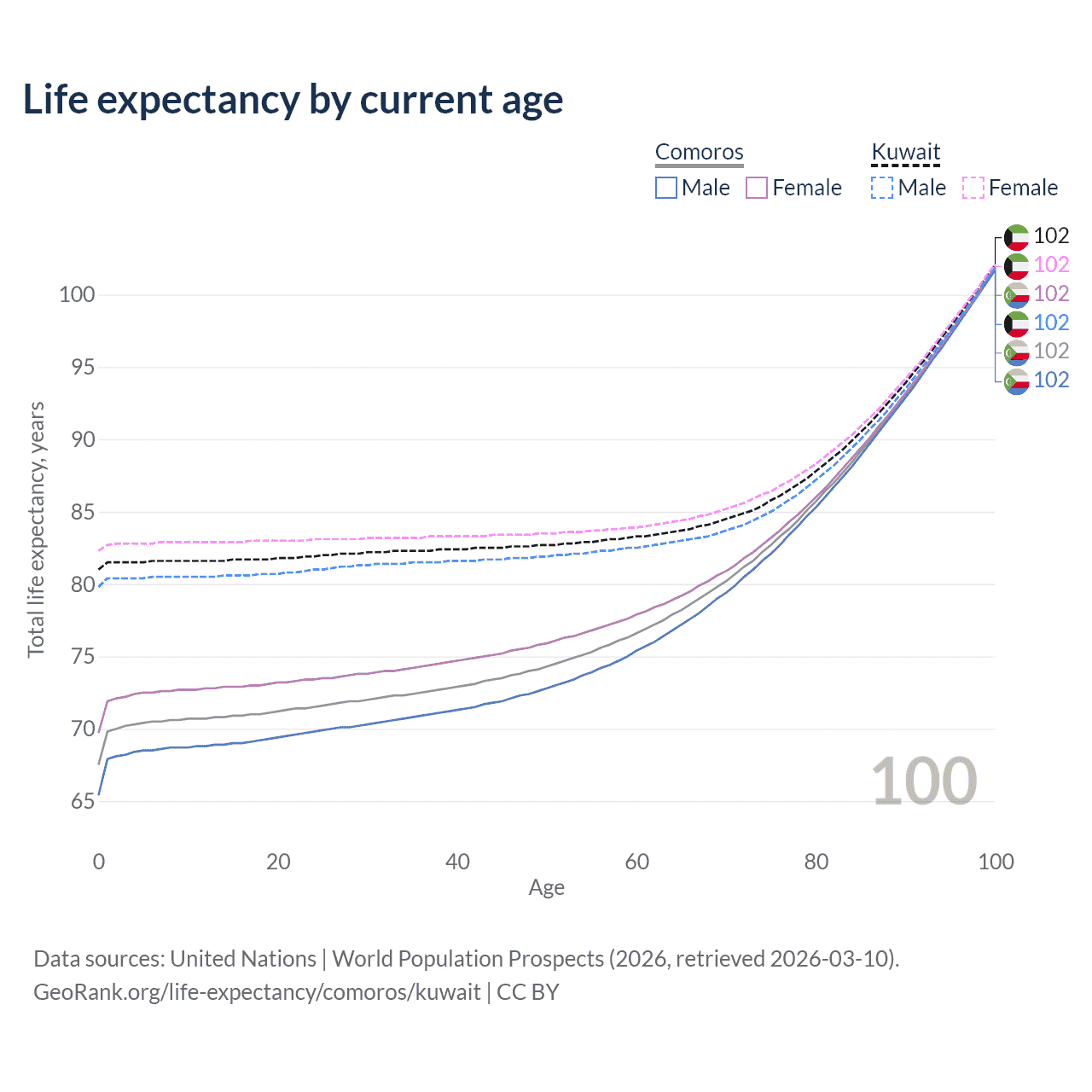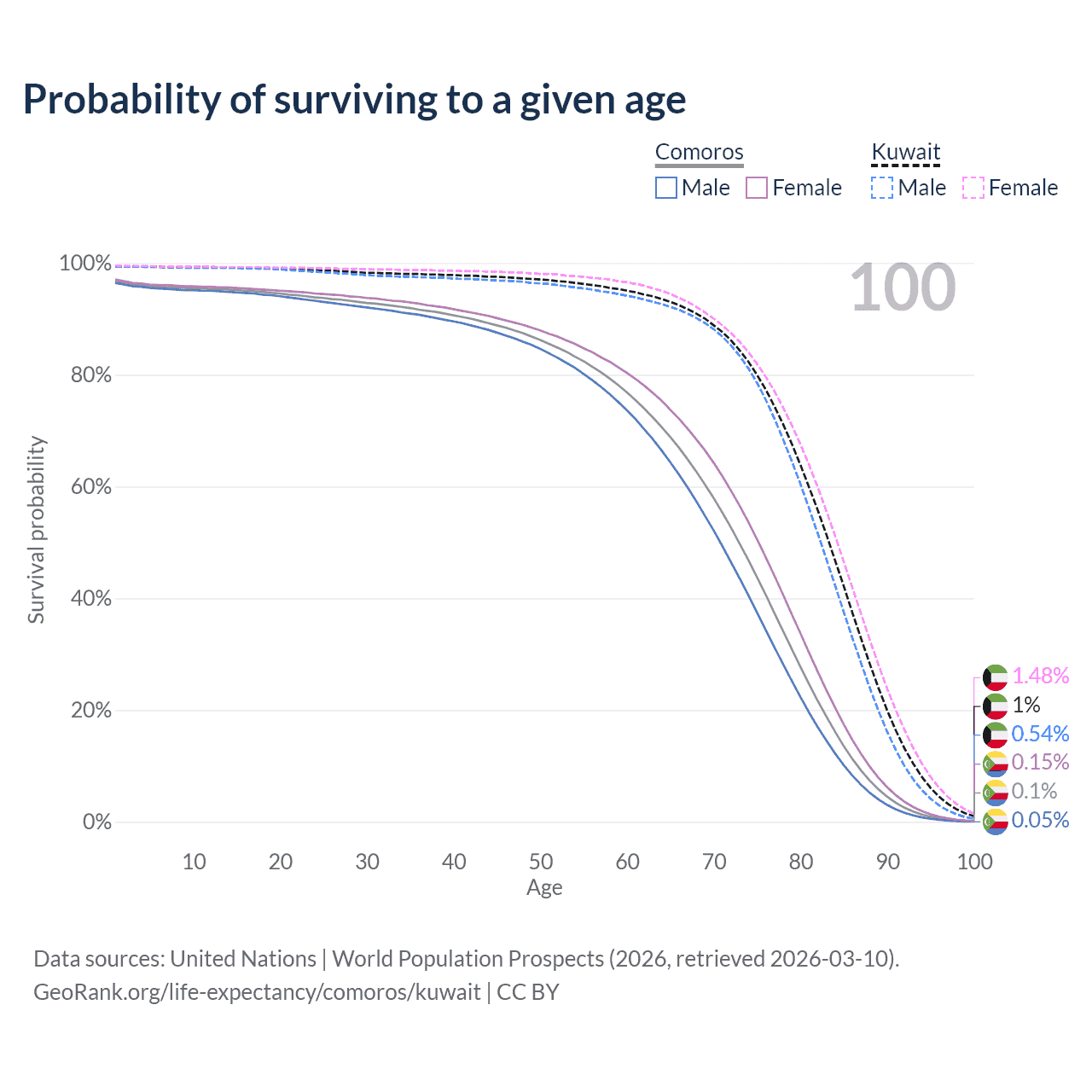 This life expectancy calculator shows the odds of living to 100, 95, 90, and below based on current age for both males and females in Comoros and Kuwait, along with mean and median age of death. The calculations are based on the 2026 life tables (actuarial tables) from the UN World Population Prospects.