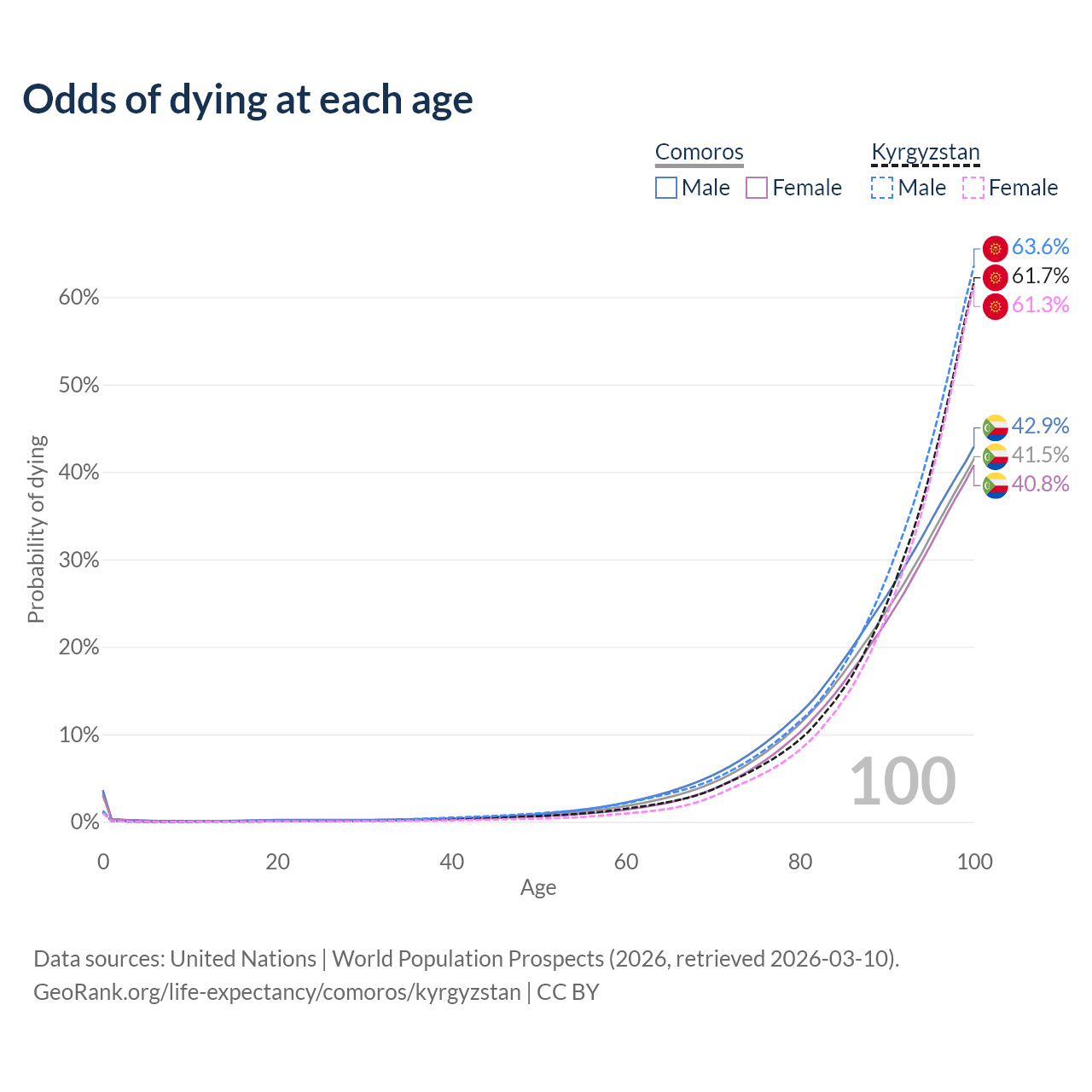 This life expectancy calculator shows the odds of living to 100, 95, 90, and below based on current age for both males and females in Comoros and Kyrgyzstan, along with mean and median age of death. The calculations are based on the 2026 life tables (actuarial tables) from the UN World Population Prospects.