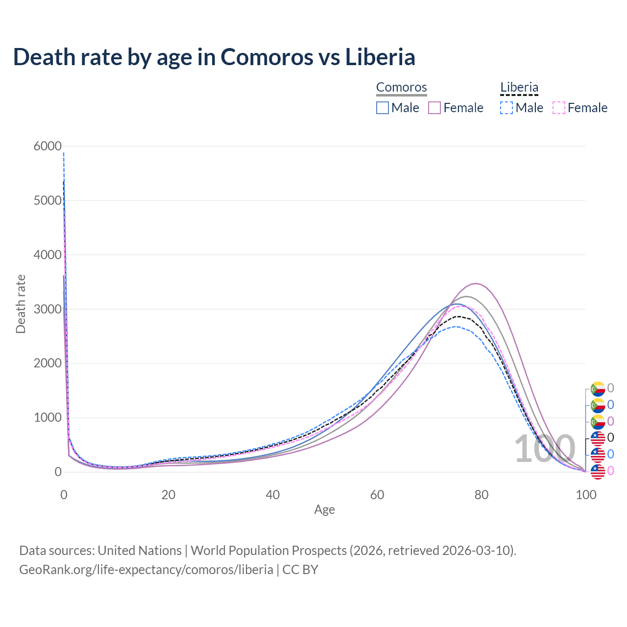 In Comoros, the most common age of death is 0, compared to 0 in Liberia. The median age of death is 72.9 in Comoros and 69.6 in Liberia, meaning only half of each cohort is expected to live past that age.