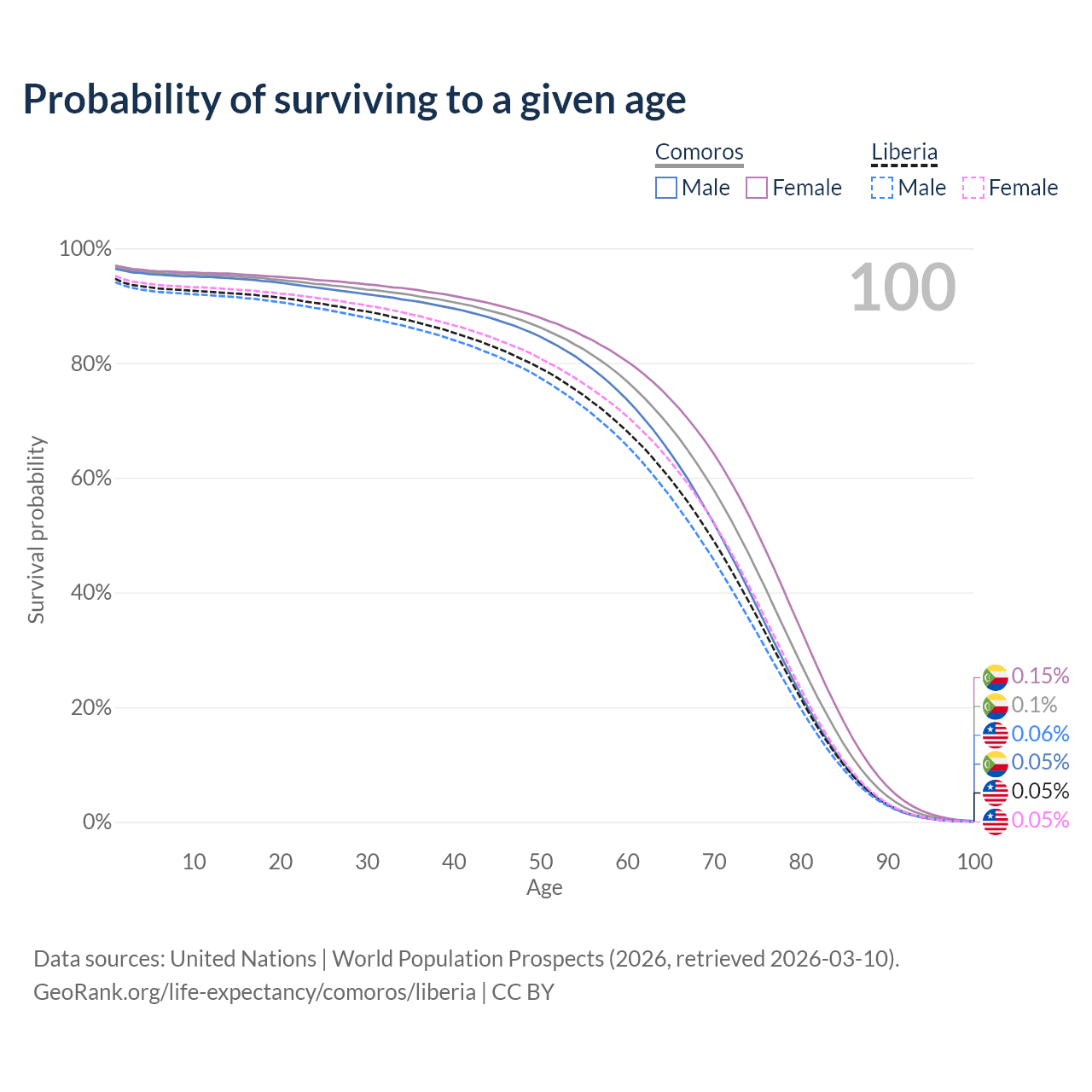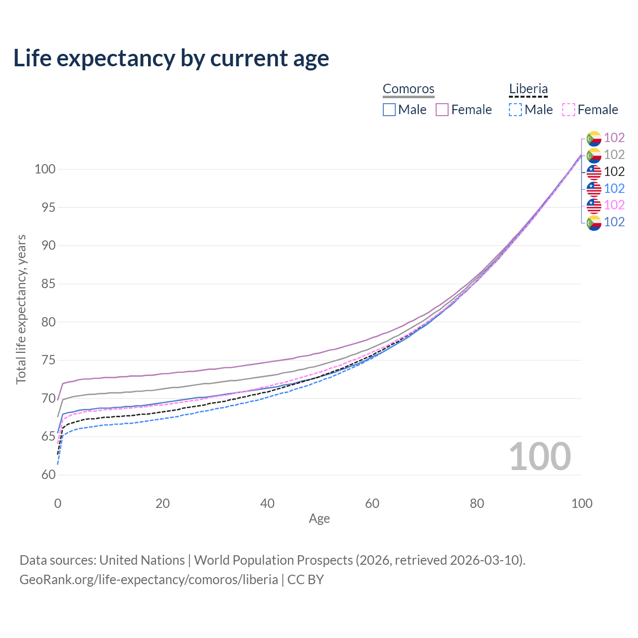 This life expectancy calculator shows the odds of living to 100, 95, 90, and below based on current age for both males and females in Comoros and Liberia, along with mean and median age of death. The calculations are based on the 2026 life tables (actuarial tables) from the UN World Population Prospects.