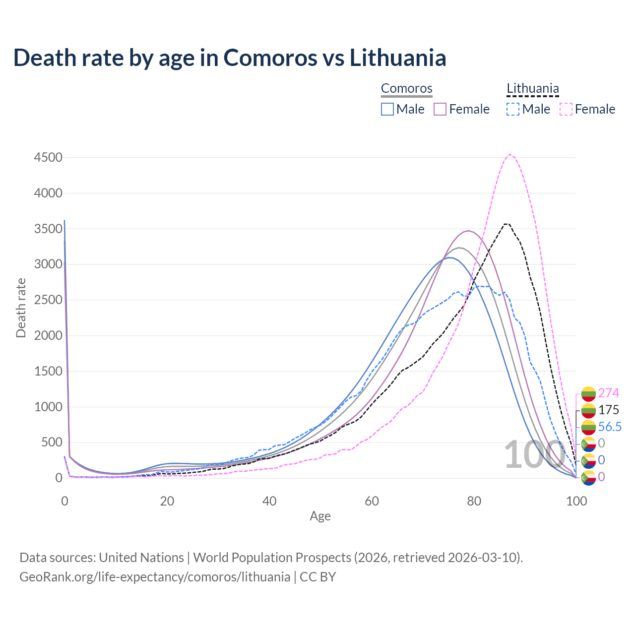 In Comoros, the most common age of death is 0, compared to 86 in Lithuania. The median age of death is 72.9 in Comoros and 80.4 in Lithuania, meaning only half of each cohort is expected to live past that age.