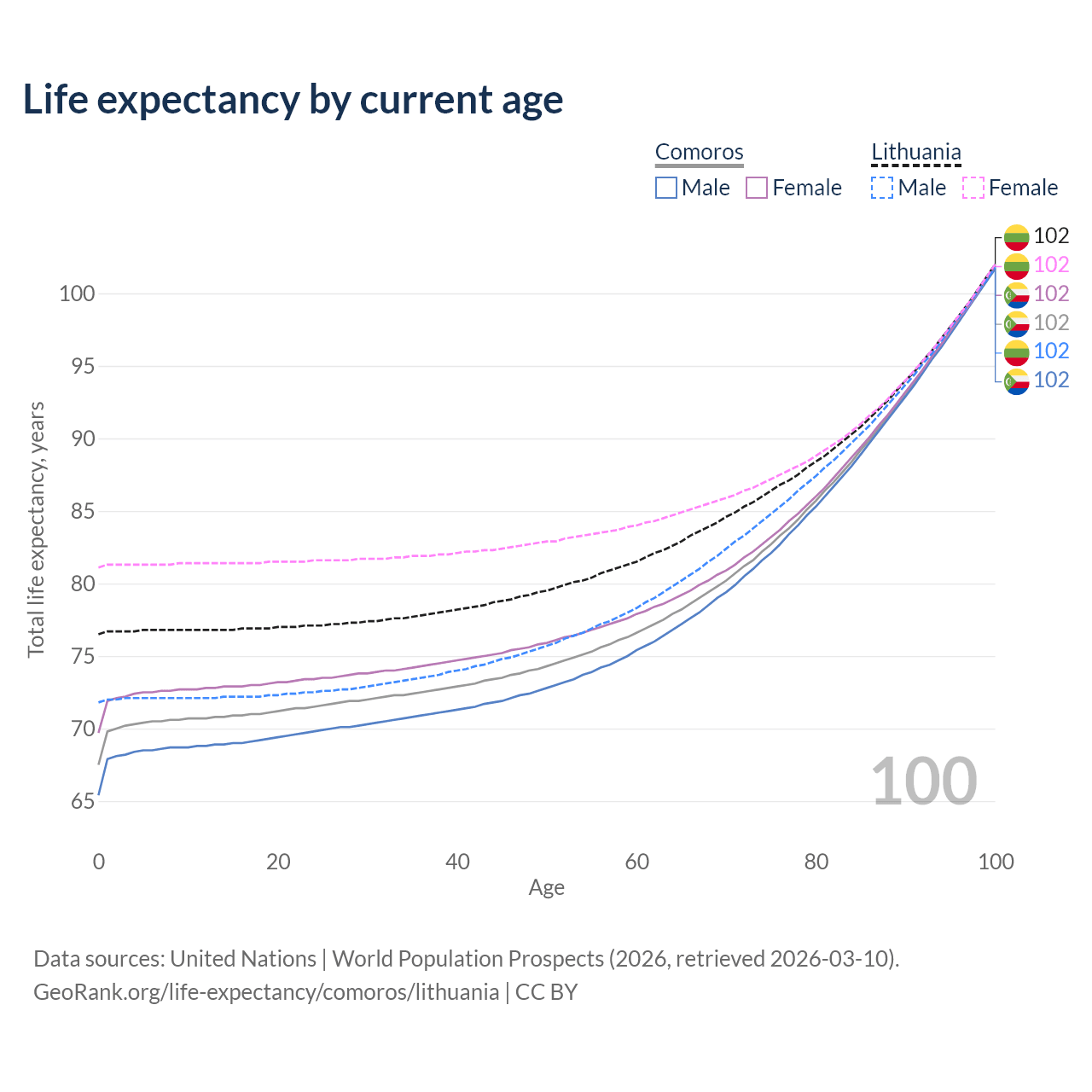 This life expectancy calculator shows the odds of living to 100, 95, 90, and below based on current age for both males and females in Comoros and Lithuania, along with mean and median age of death. The calculations are based on the 2026 life tables (actuarial tables) from the UN World Population Prospects.