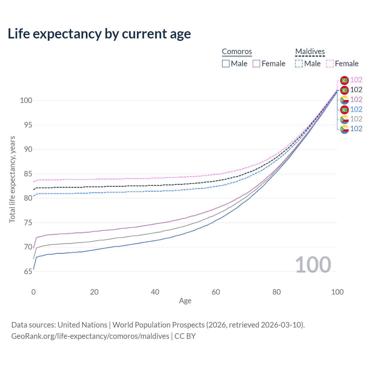 This life expectancy calculator shows the odds of living to 100, 95, 90, and below based on current age for both males and females in Comoros and Maldives, along with mean and median age of death. The calculations are based on the 2026 life tables (actuarial tables) from the UN World Population Prospects.