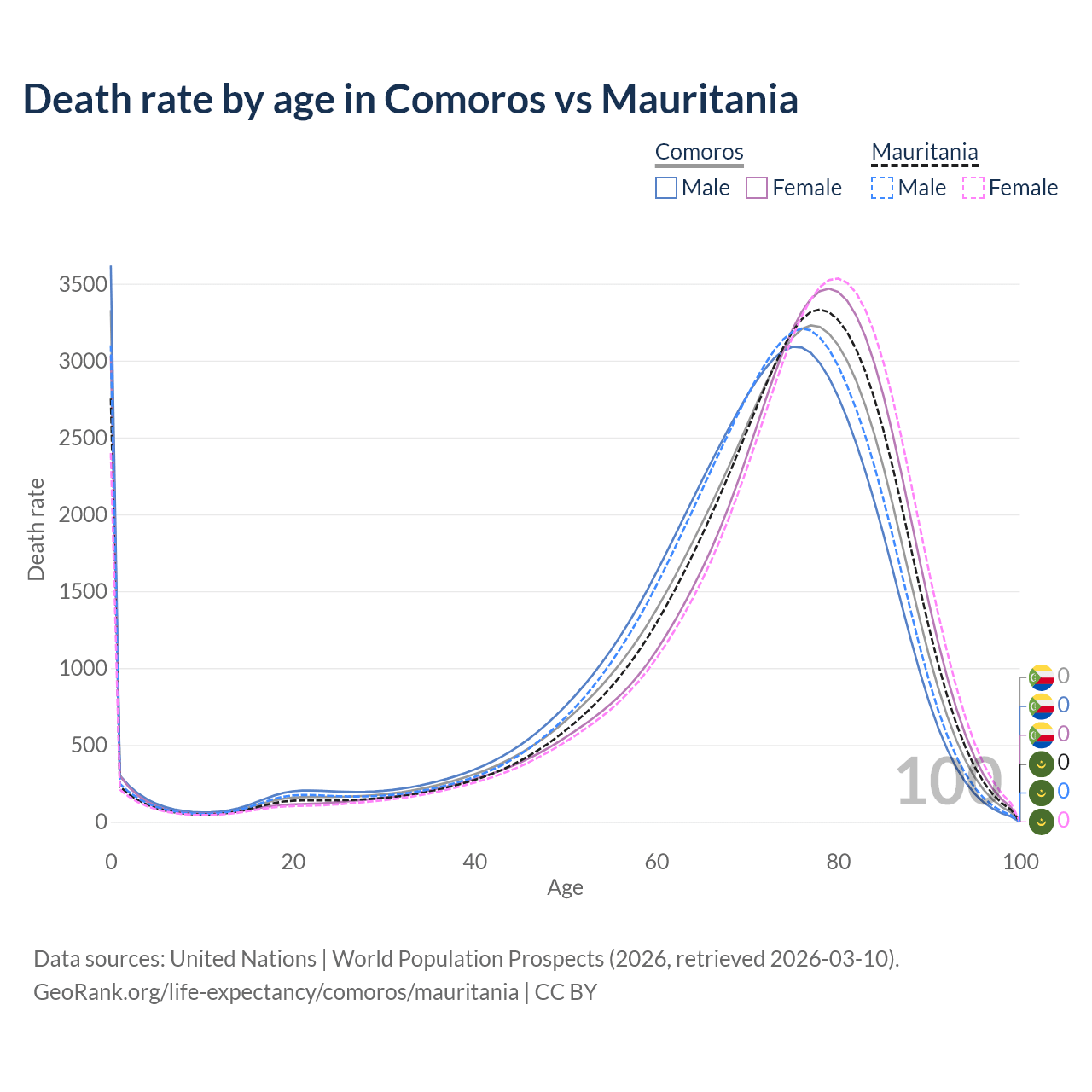 In Comoros, the most common age of death is 0, compared to 78 in Mauritania. The median age of death is 72.9 in Comoros and 74.1 in Mauritania, meaning only half of each cohort is expected to live past that age.