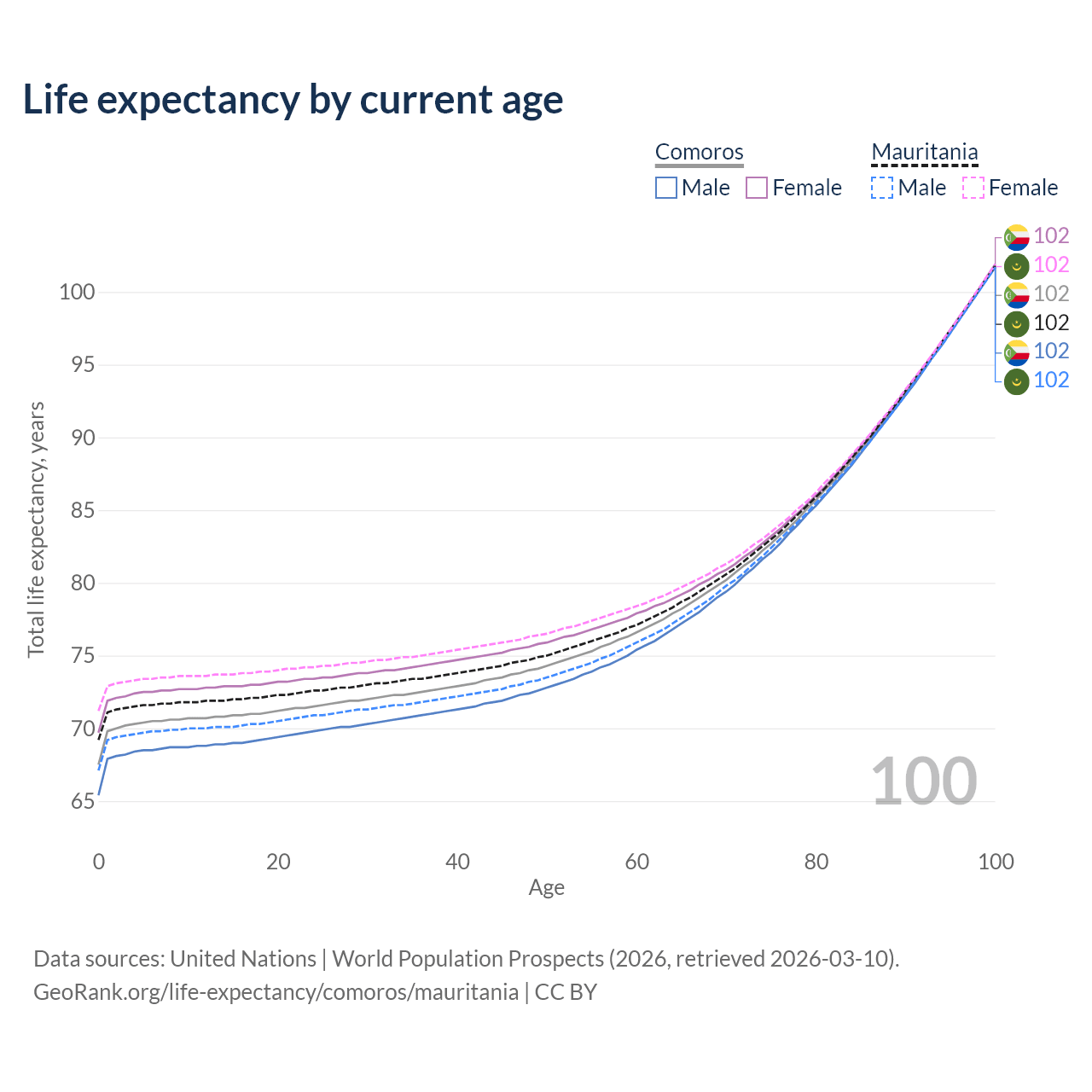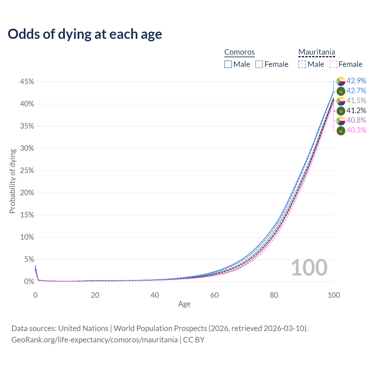 This life expectancy calculator shows the odds of living to 100, 95, 90, and below based on current age for both males and females in Comoros and Mauritania, along with mean and median age of death. The calculations are based on the 2026 life tables (actuarial tables) from the UN World Population Prospects.