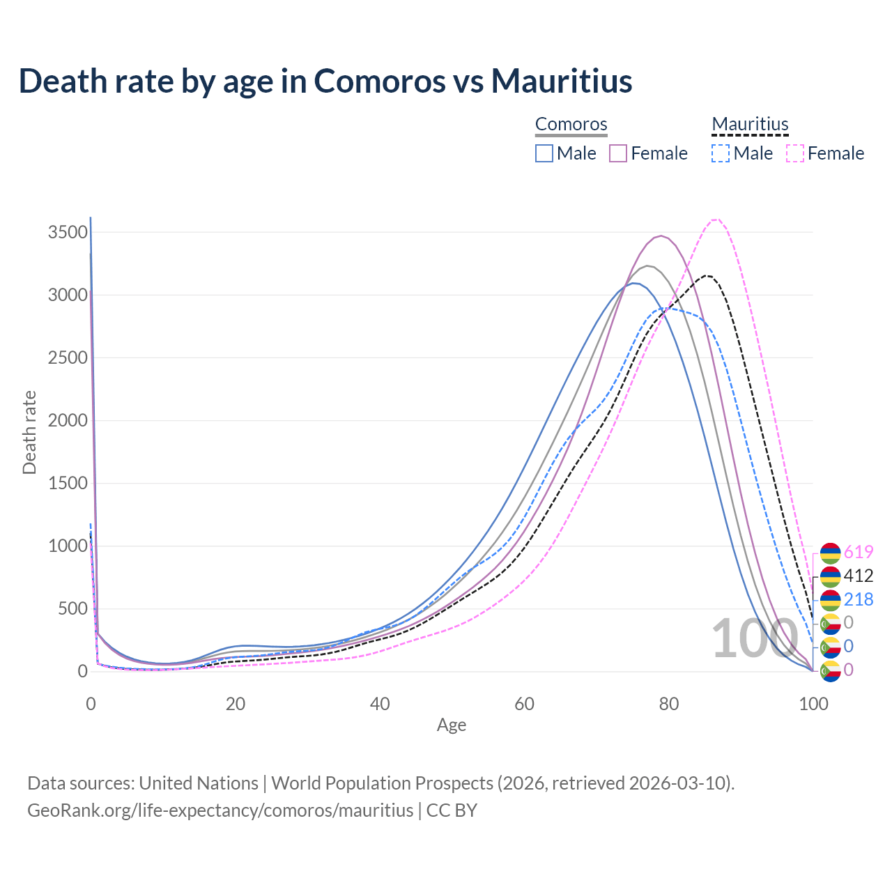 In Comoros, the most common age of death is 0, compared to 85 in Mauritius. The median age of death is 72.9 in Comoros and 79.1 in Mauritius, meaning only half of each cohort is expected to live past that age.