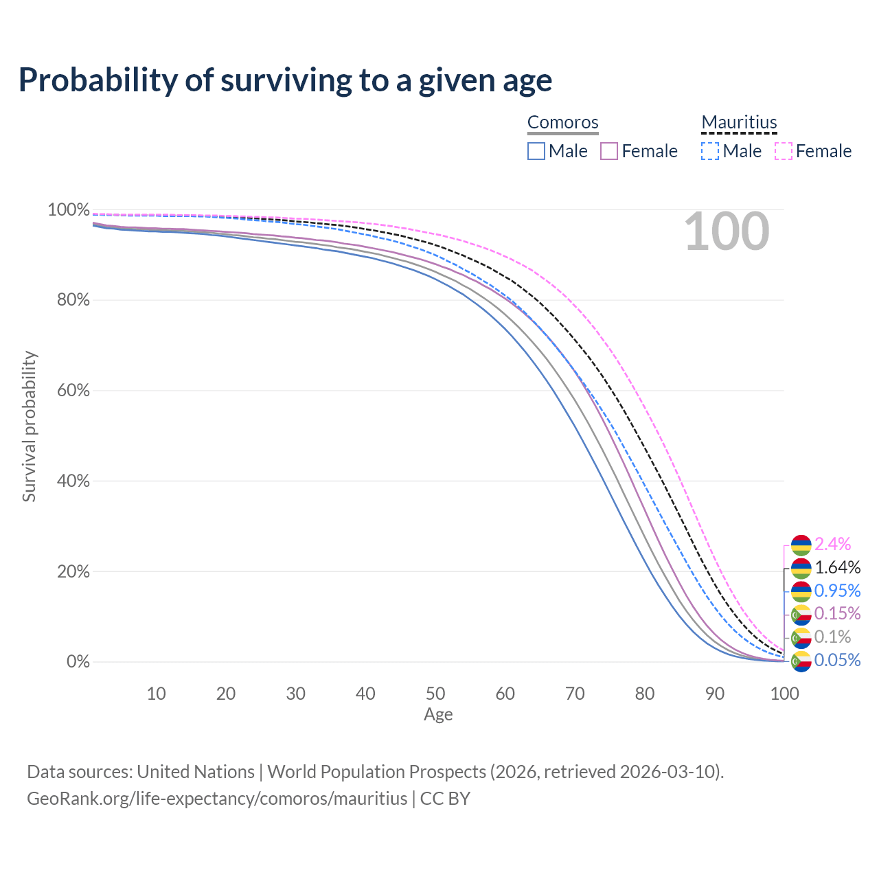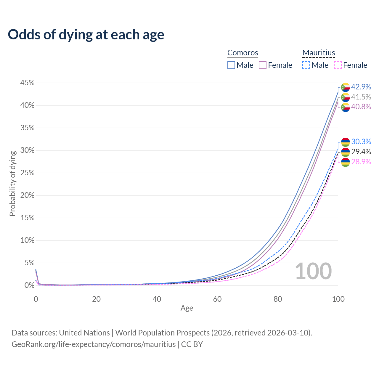This life expectancy calculator shows the odds of living to 100, 95, 90, and below based on current age for both males and females in Comoros and Mauritius, along with mean and median age of death. The calculations are based on the 2026 life tables (actuarial tables) from the UN World Population Prospects.