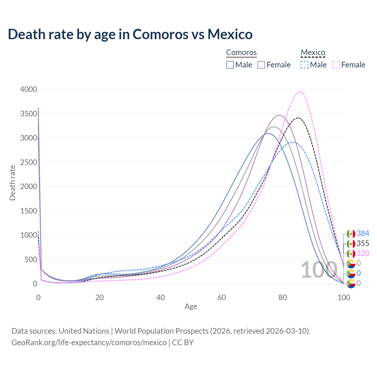 In Comoros, the most common age of death is 0, compared to 85 in Mexico. The median age of death is 72.9 in Comoros and 80.1 in Mexico, meaning only half of each cohort is expected to live past that age.