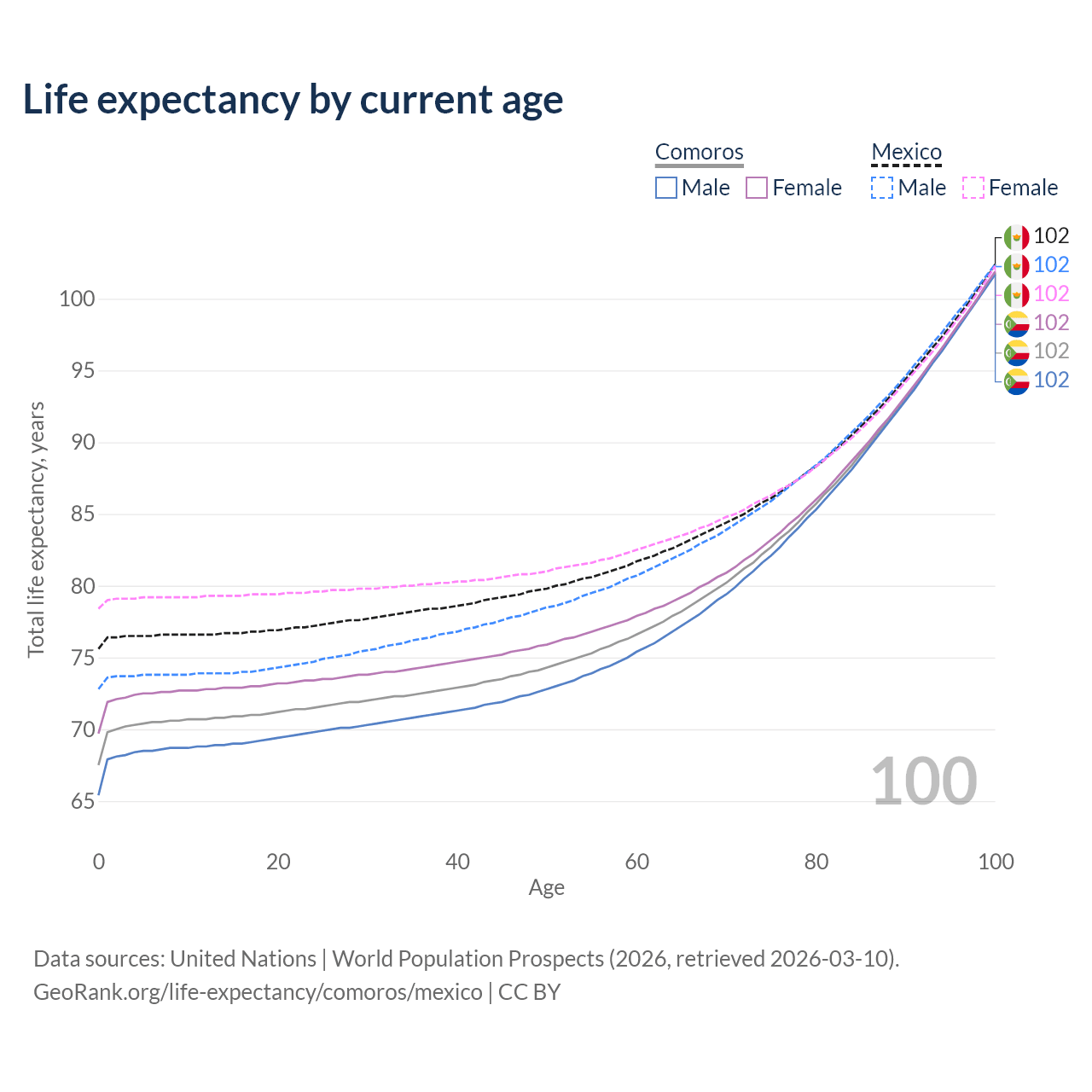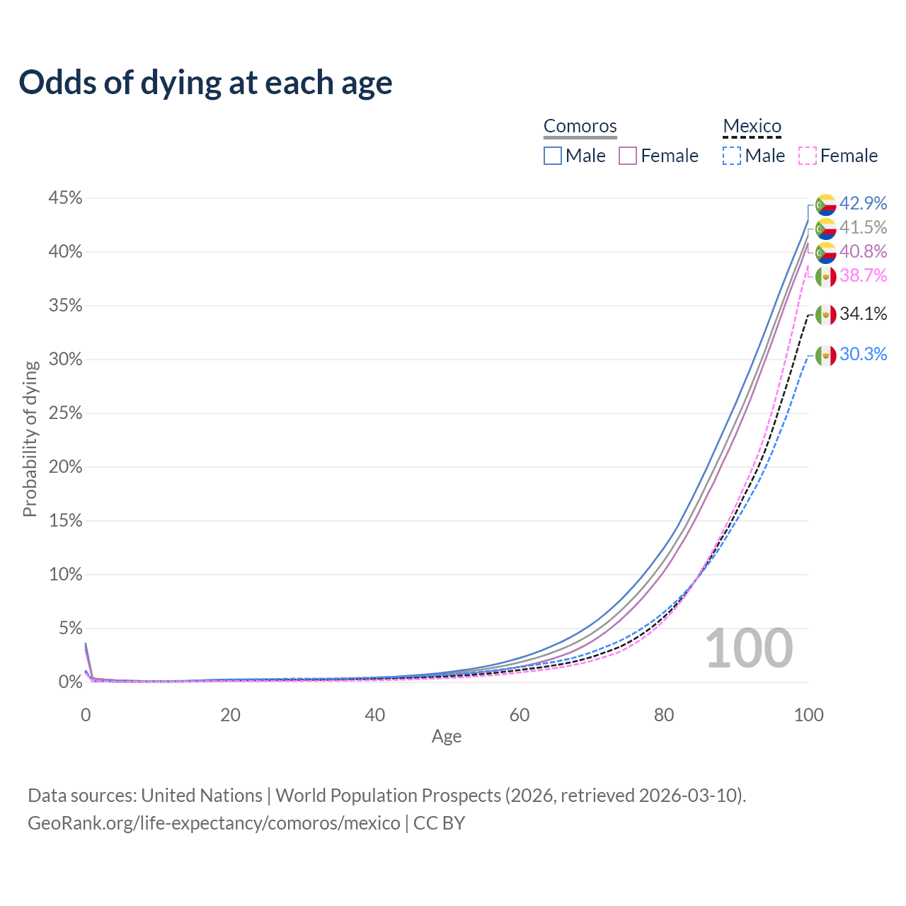 This life expectancy calculator shows the odds of living to 100, 95, 90, and below based on current age for both males and females in Comoros and Mexico, along with mean and median age of death. The calculations are based on the 2026 life tables (actuarial tables) from the UN World Population Prospects.