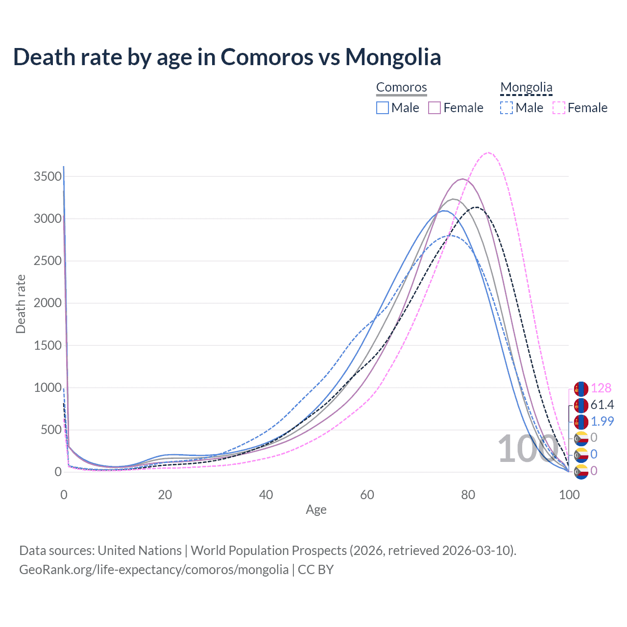In Comoros, the most common age of death is 0, compared to 82 in Mongolia. The median age of death is 72.9 in Comoros and 76 in Mongolia, meaning only half of each cohort is expected to live past that age.