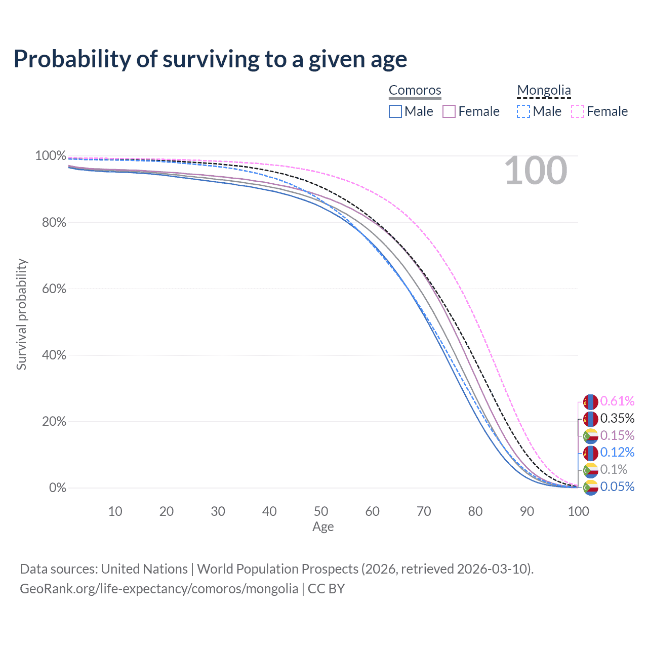This life expectancy calculator shows the odds of living to 100, 95, 90, and below based on current age for both males and females in Comoros and Mongolia, along with mean and median age of death. The calculations are based on the 2026 life tables (actuarial tables) from the UN World Population Prospects.