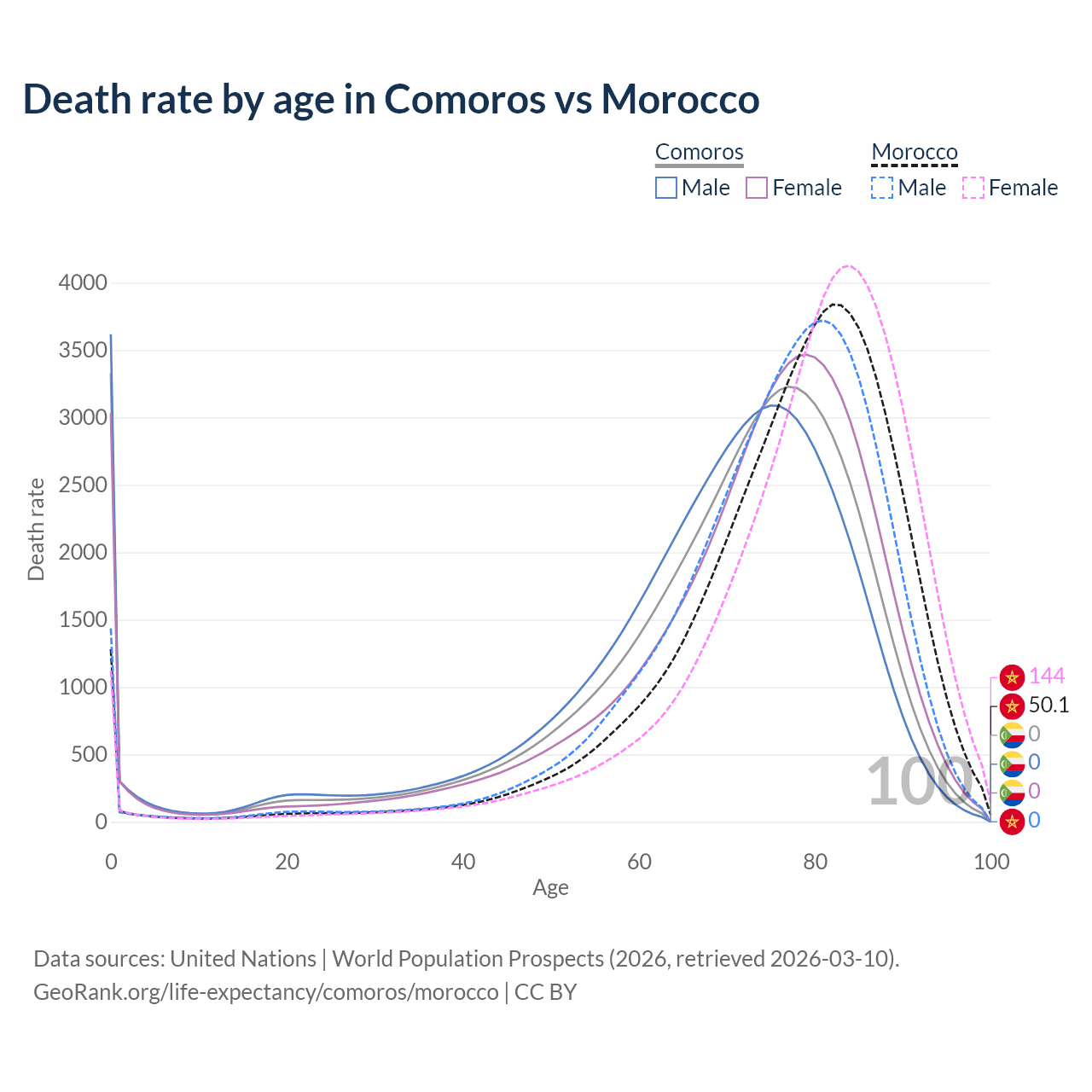 This life expectancy calculator shows the odds of living to 100, 95, 90, and below based on current age for both males and females in Comoros and Morocco, along with mean and median age of death. The calculations are based on the 2026 life tables (actuarial tables) from the UN World Population Prospects.
