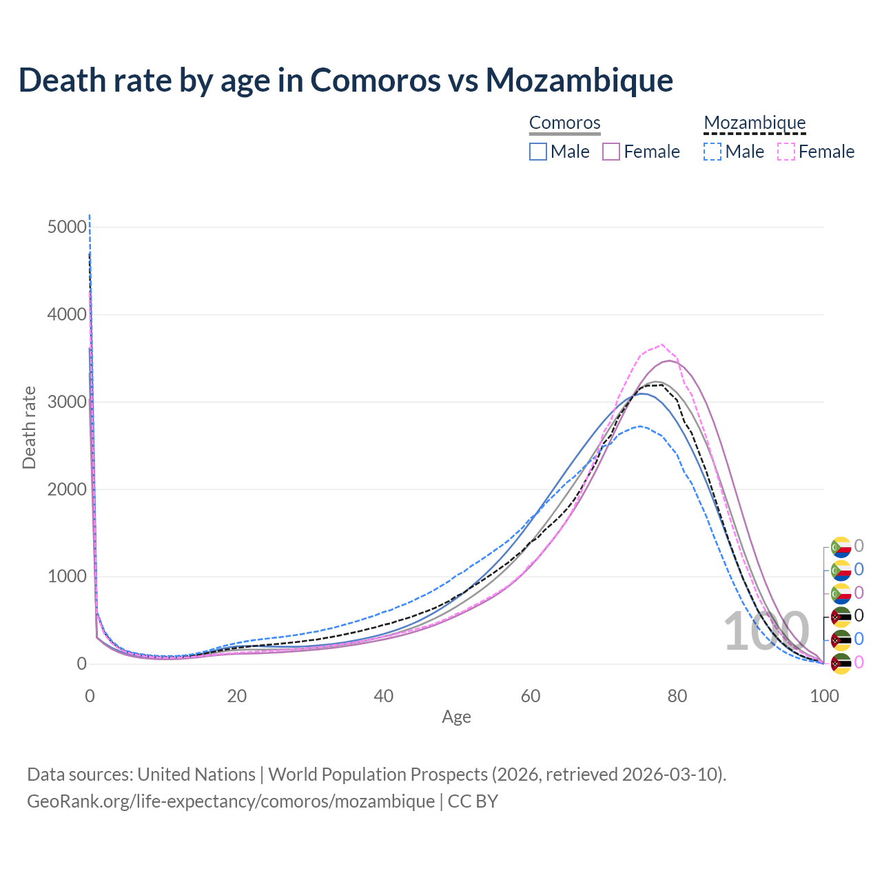 Note that this chart does not show rates per 100,000 population, as those would be skewed by age structure differences and reflect the demographics of Comoros and Mozambique more than their death rates.