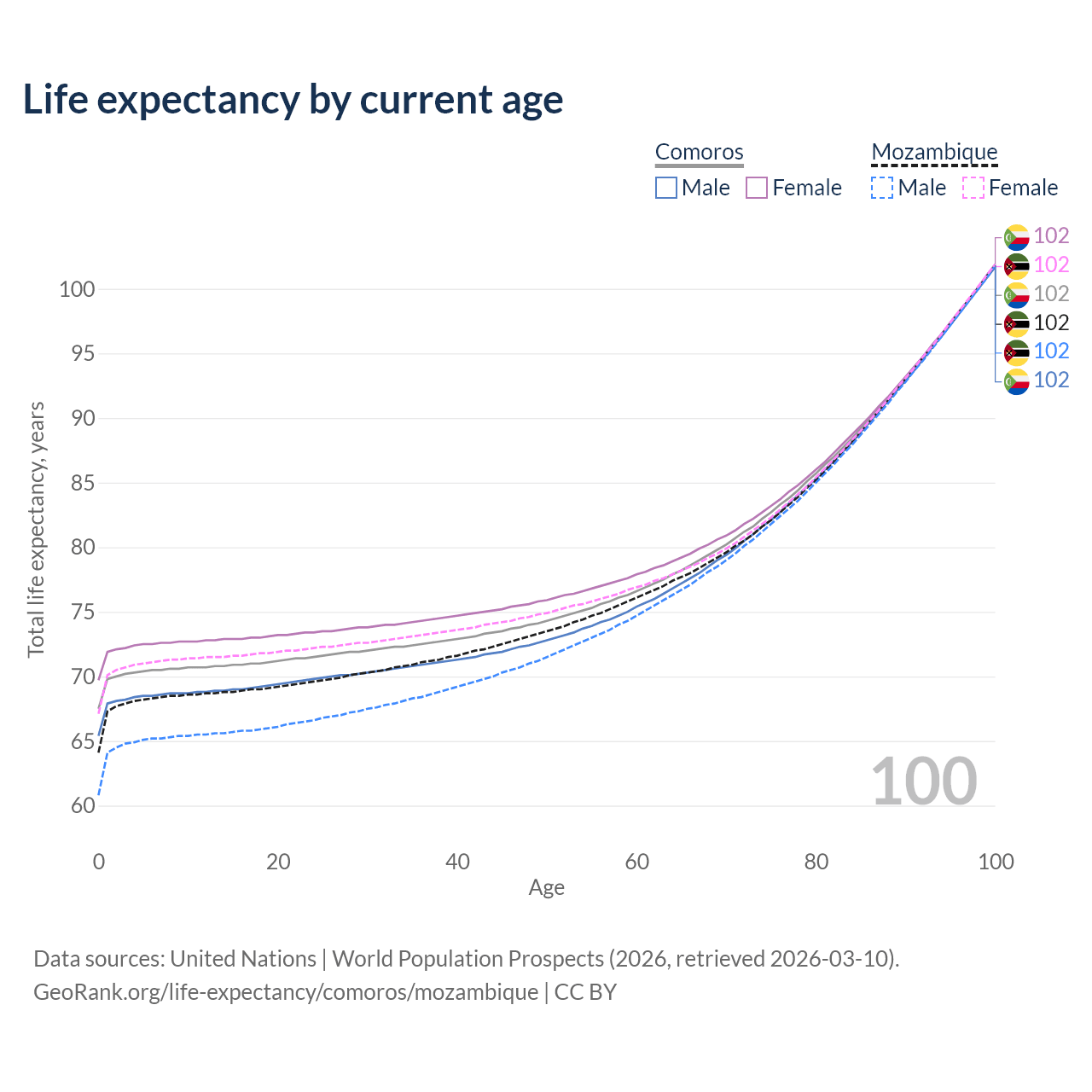 This life expectancy calculator shows the odds of living to 100, 95, 90, and below based on current age for both males and females in Comoros and Mozambique, along with mean and median age of death. The calculations are based on the 2026 life tables (actuarial tables) from the UN World Population Prospects.