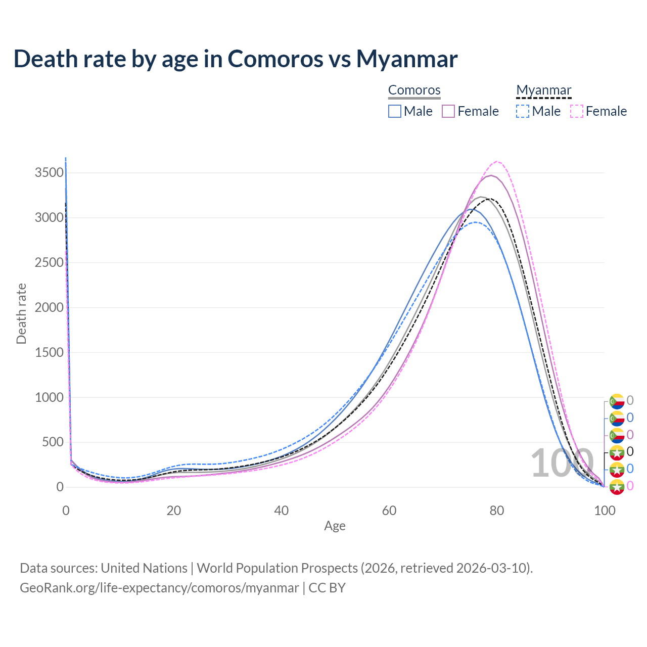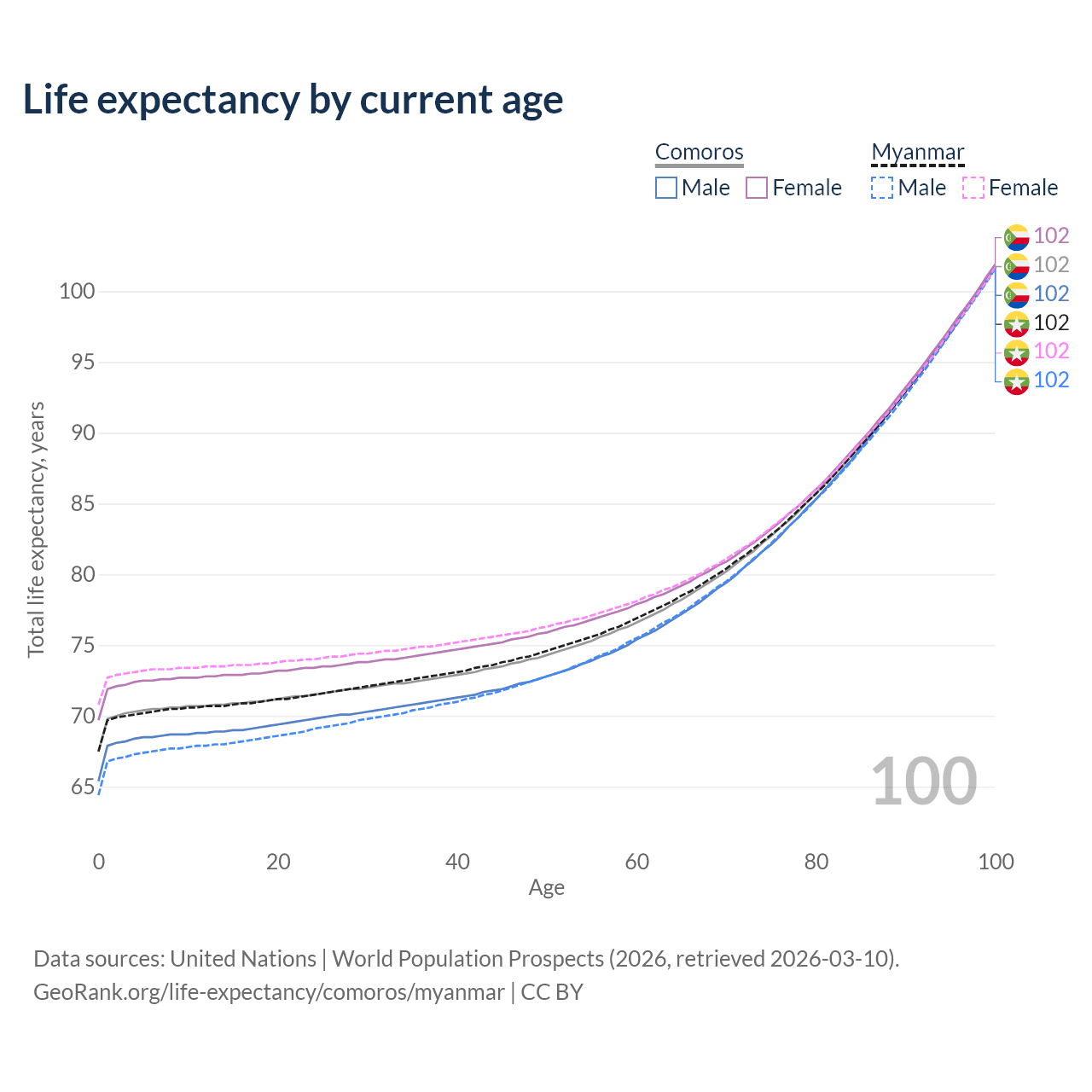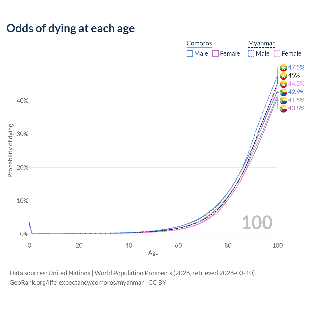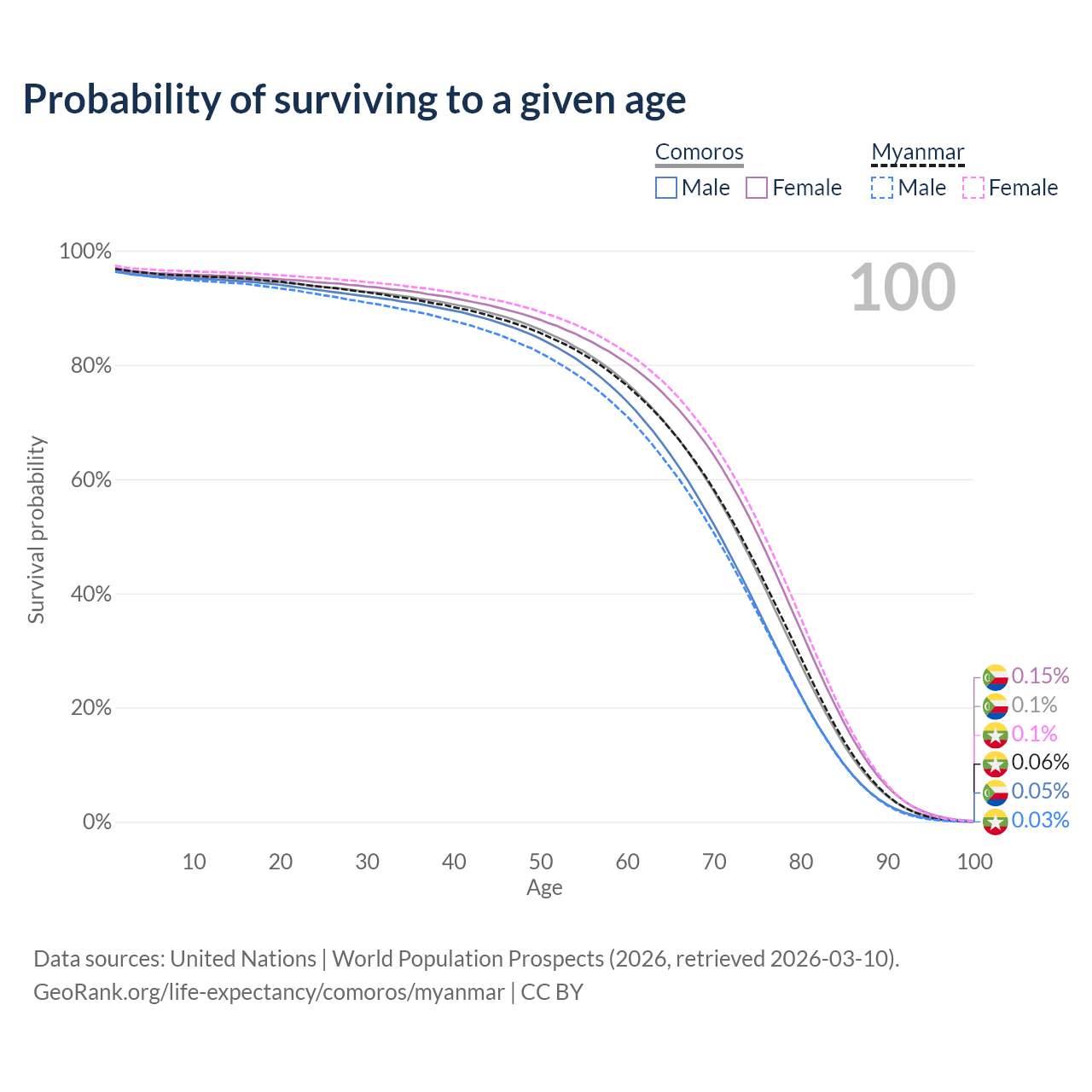 This life expectancy calculator shows the odds of living to 100, 95, 90, and below based on current age for both males and females in Comoros and Myanmar, along with mean and median age of death. The calculations are based on the 2026 life tables (actuarial tables) from the UN World Population Prospects.