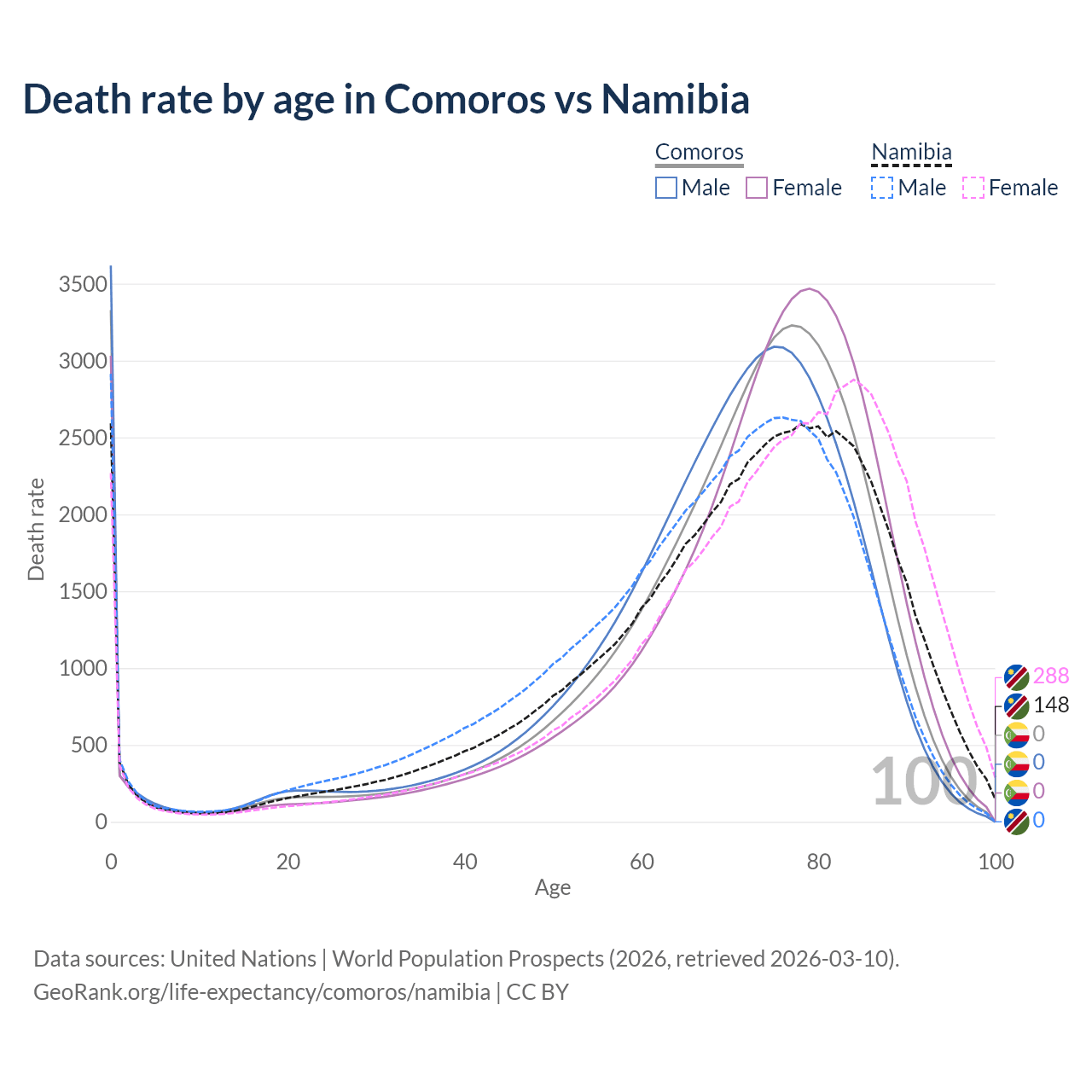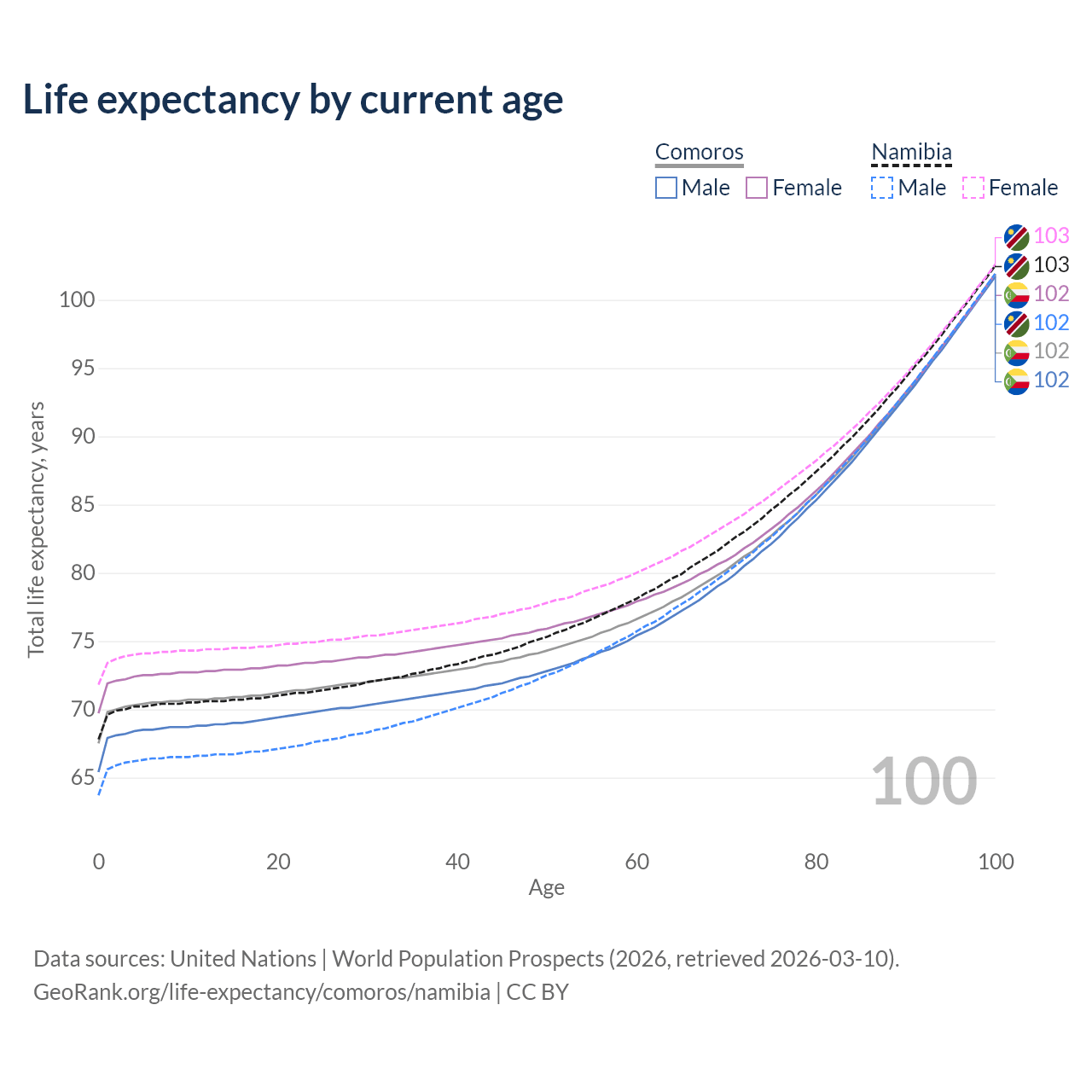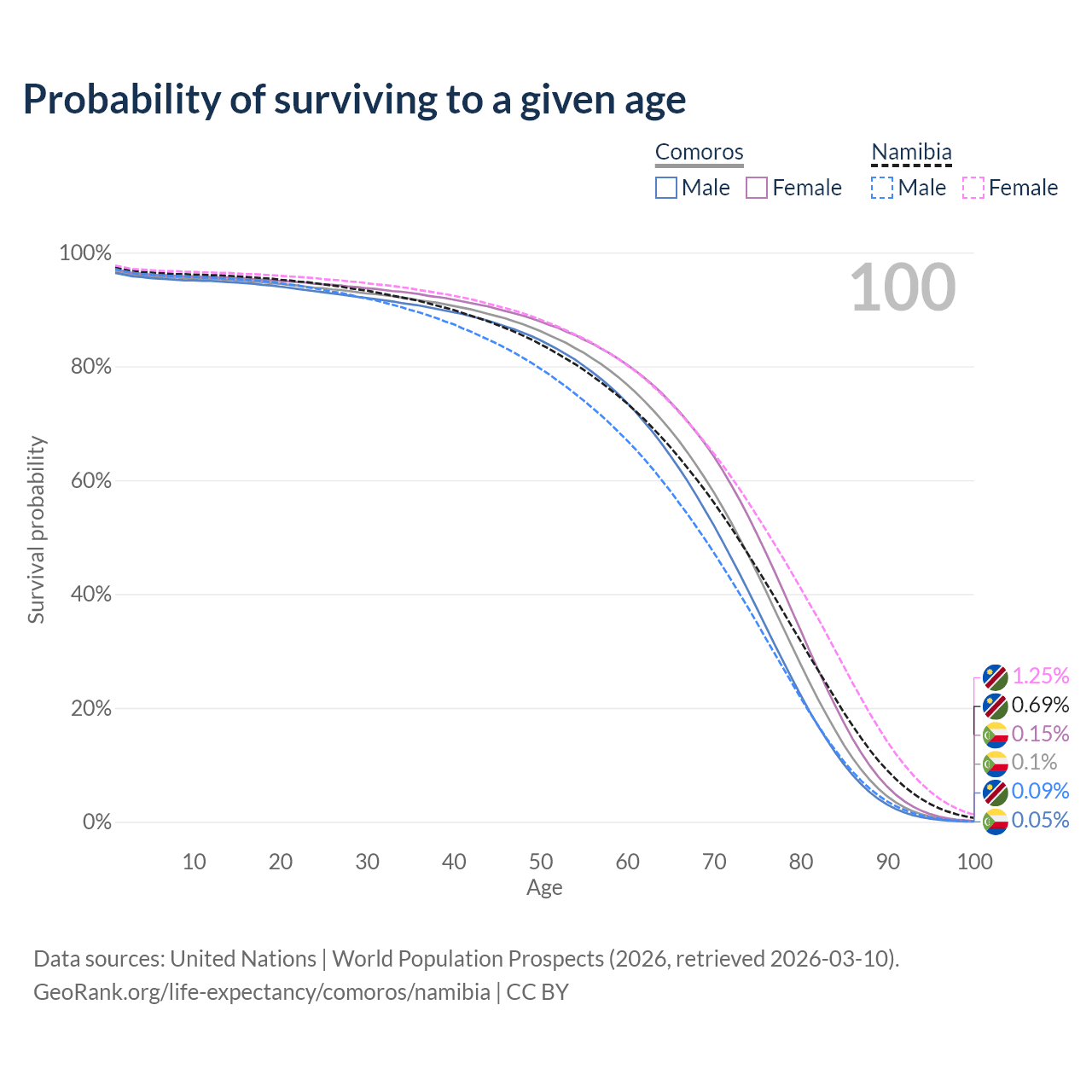 This life expectancy calculator shows the odds of living to 100, 95, 90, and below based on current age for both males and females in Comoros and Namibia, along with mean and median age of death. The calculations are based on the 2026 life tables (actuarial tables) from the UN World Population Prospects.