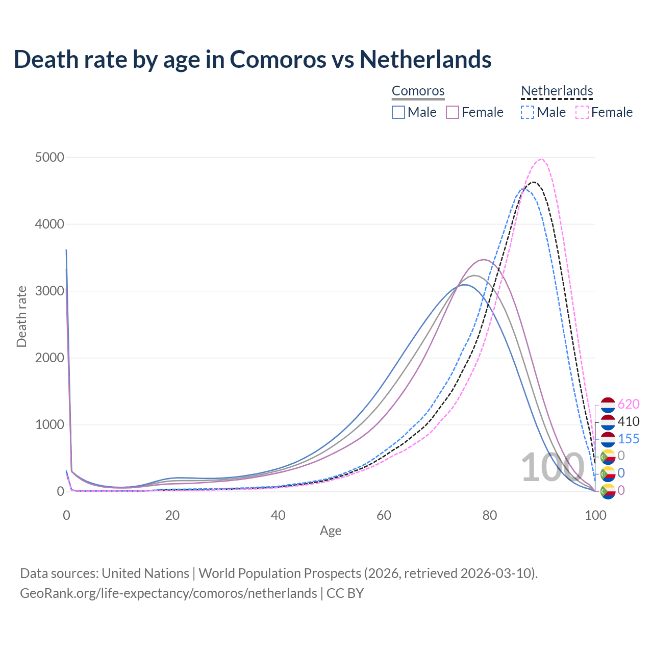 In Comoros, the most common age of death is 0, compared to 88 in the Netherlands. The median age of death is 72.9 in Comoros and 85.5 in the Netherlands, meaning only half of each cohort is expected to live past that age.