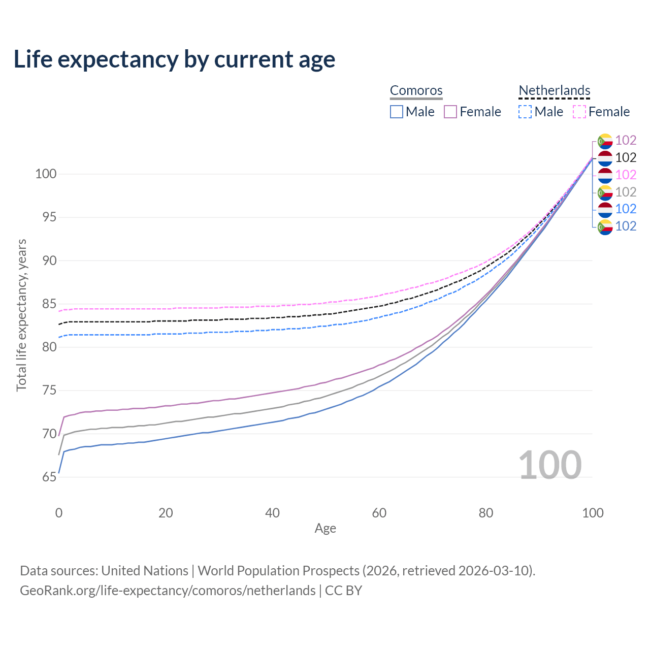 This life expectancy calculator shows the odds of living to 100, 95, 90, and below based on current age for both males and females in Comoros and the Netherlands, along with mean and median age of death. The calculations are based on the 2026 life tables (actuarial tables) from the UN World Population Prospects.