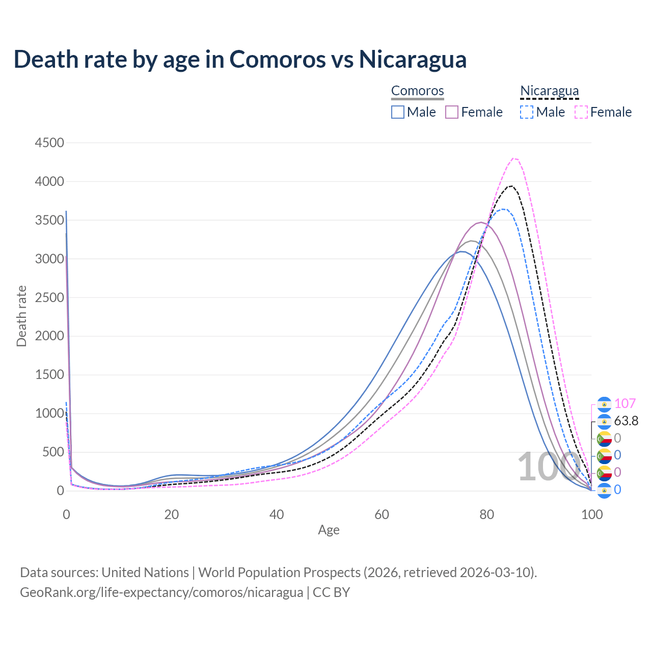 In Comoros, the most common age of death is 0, compared to 85 in Nicaragua. The median age of death is 72.9 in Comoros and 79.9 in Nicaragua, meaning only half of each cohort is expected to live past that age.