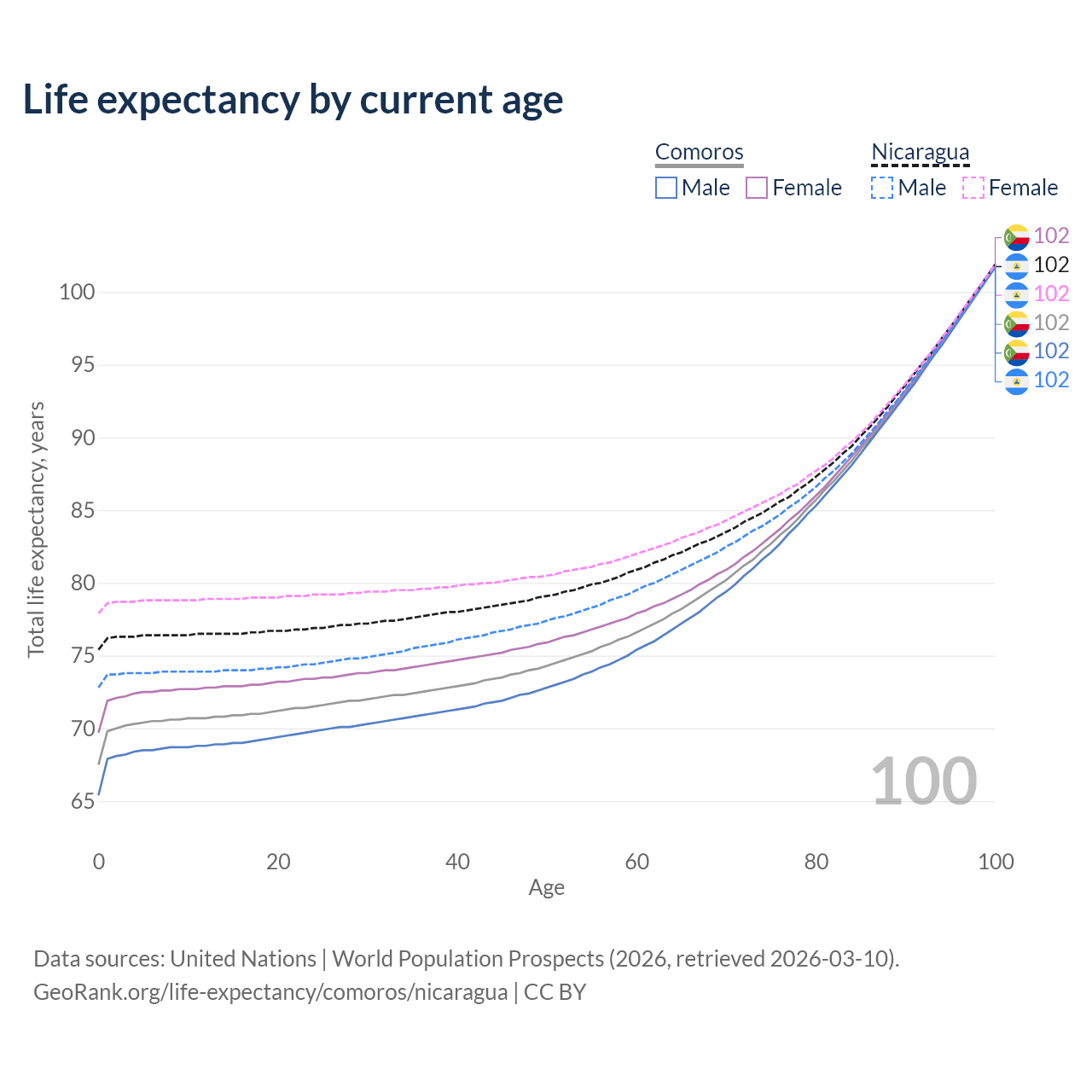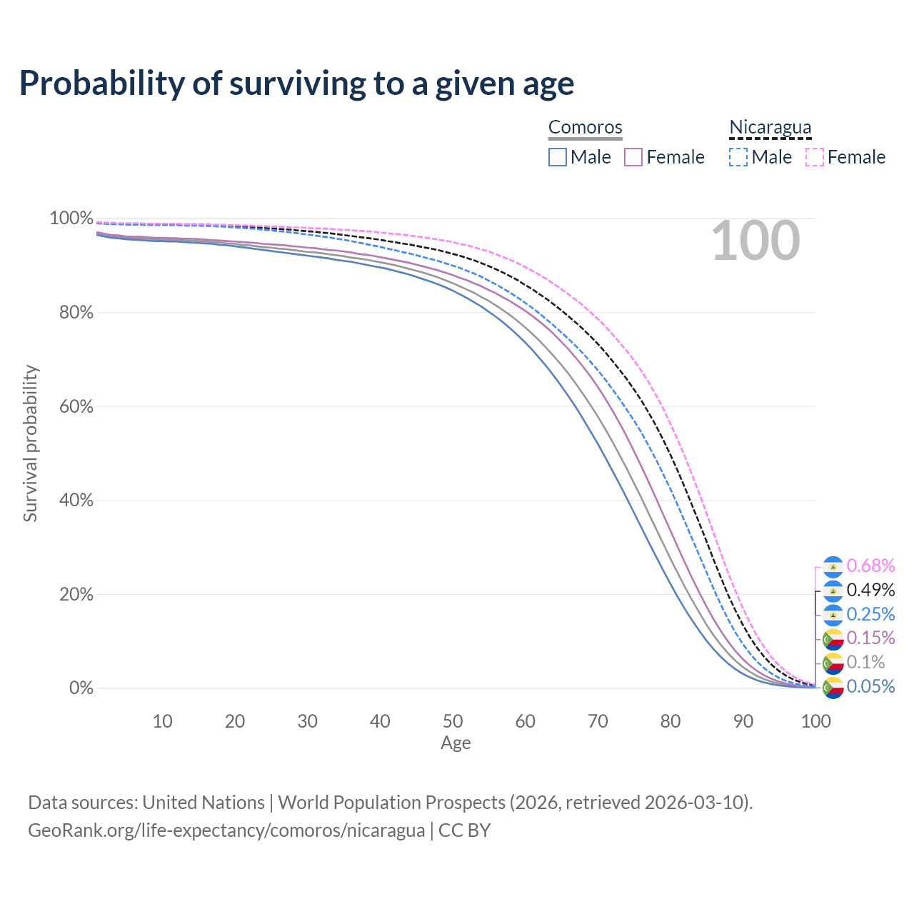 This life expectancy calculator shows the odds of living to 100, 95, 90, and below based on current age for both males and females in Comoros and Nicaragua, along with mean and median age of death. The calculations are based on the 2026 life tables (actuarial tables) from the UN World Population Prospects.