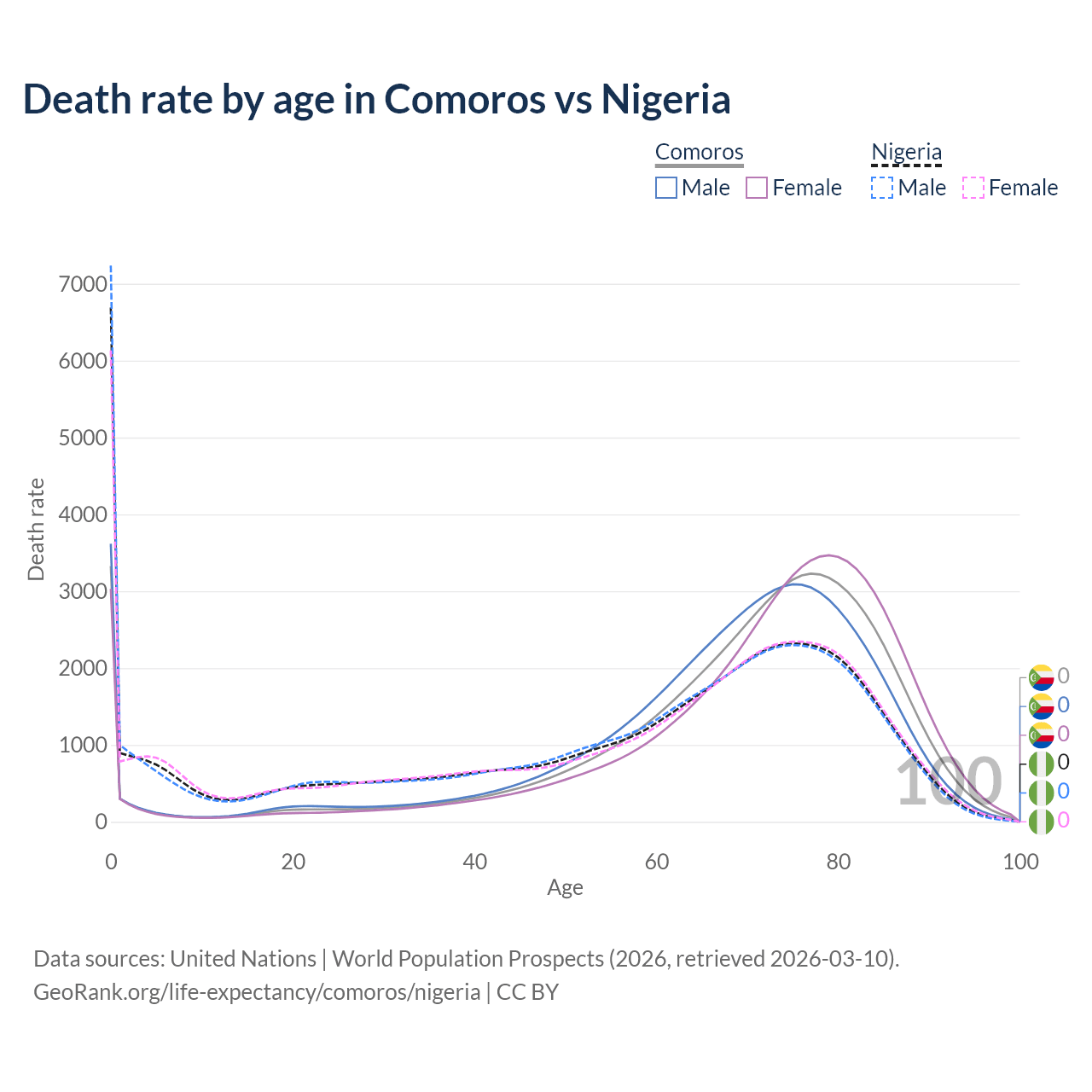 In Comoros, the most common age of death is 0, compared to 0 in Nigeria. The median age of death is 72.9 in Comoros and 64.3 in Nigeria, meaning only half of each cohort is expected to live past that age.
