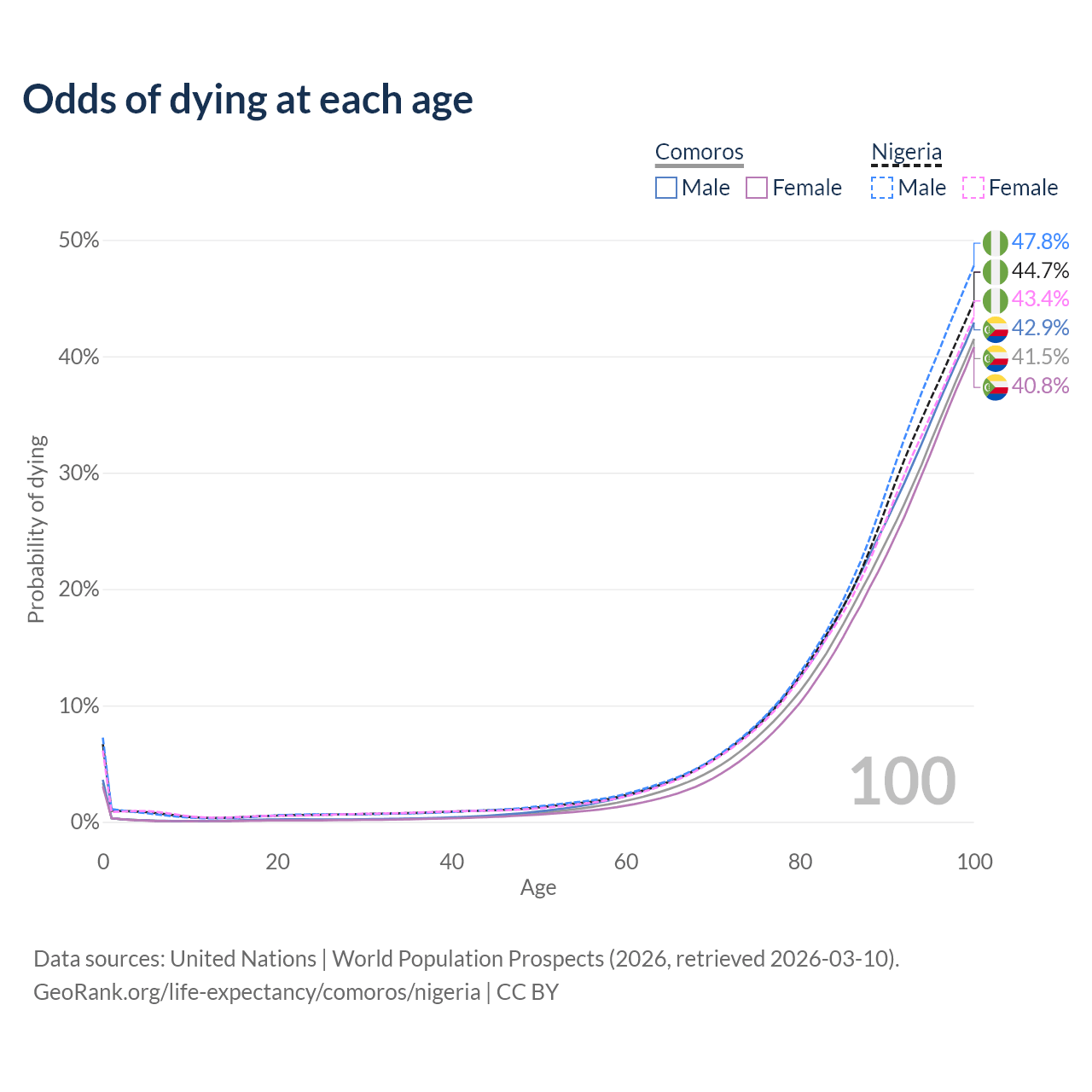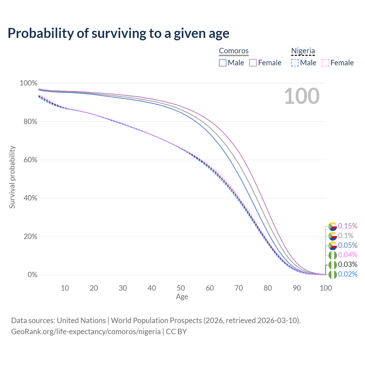 This life expectancy calculator shows the odds of living to 100, 95, 90, and below based on current age for both males and females in Comoros and Nigeria, along with mean and median age of death. The calculations are based on the 2026 life tables (actuarial tables) from the UN World Population Prospects.