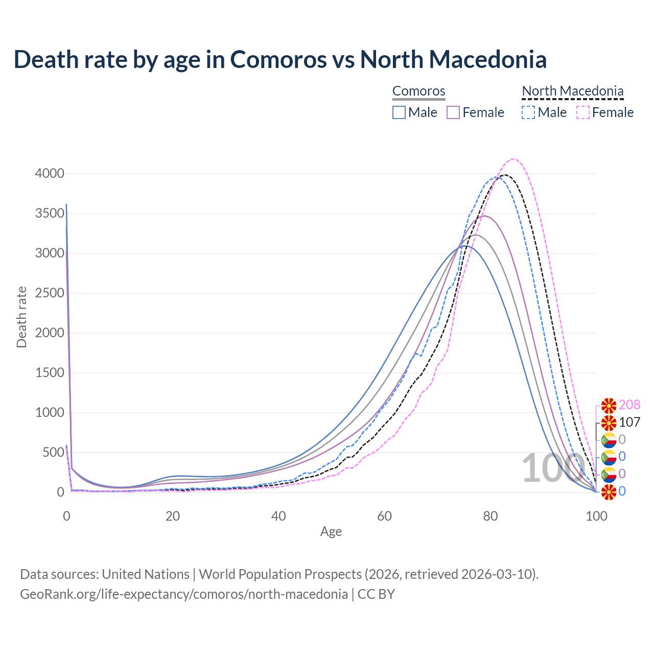 In Comoros, the most common age of death is 0, compared to 83 in North Macedonia. The median age of death is 72.9 in Comoros and 80.3 in North Macedonia, meaning only half of each cohort is expected to live past that age.