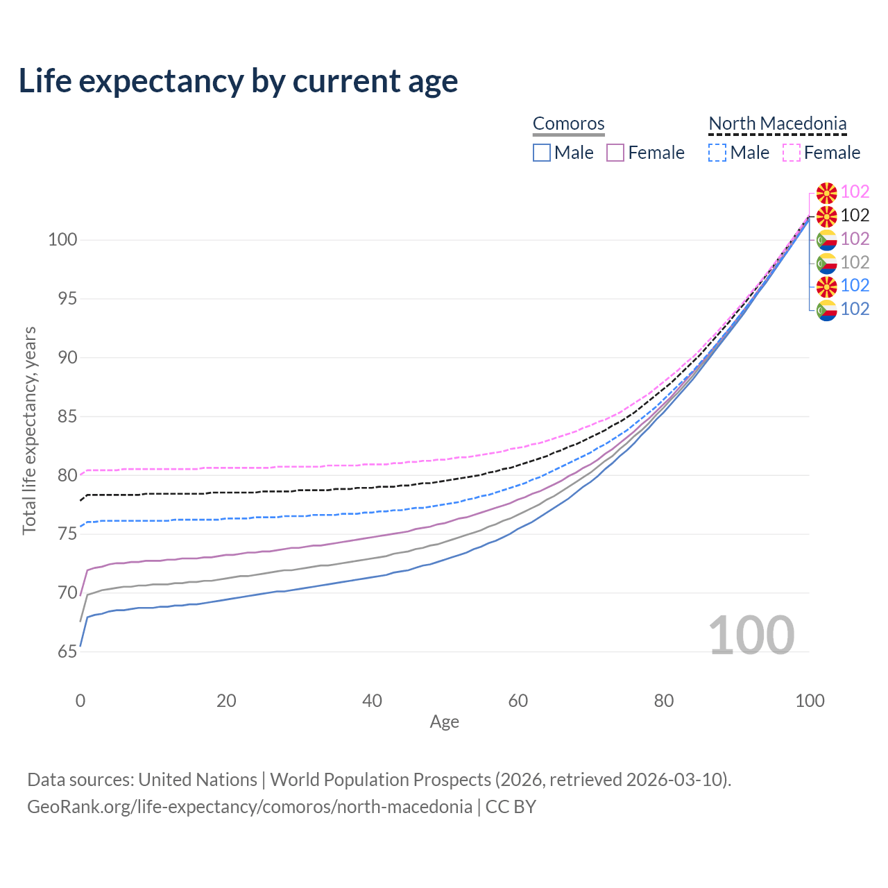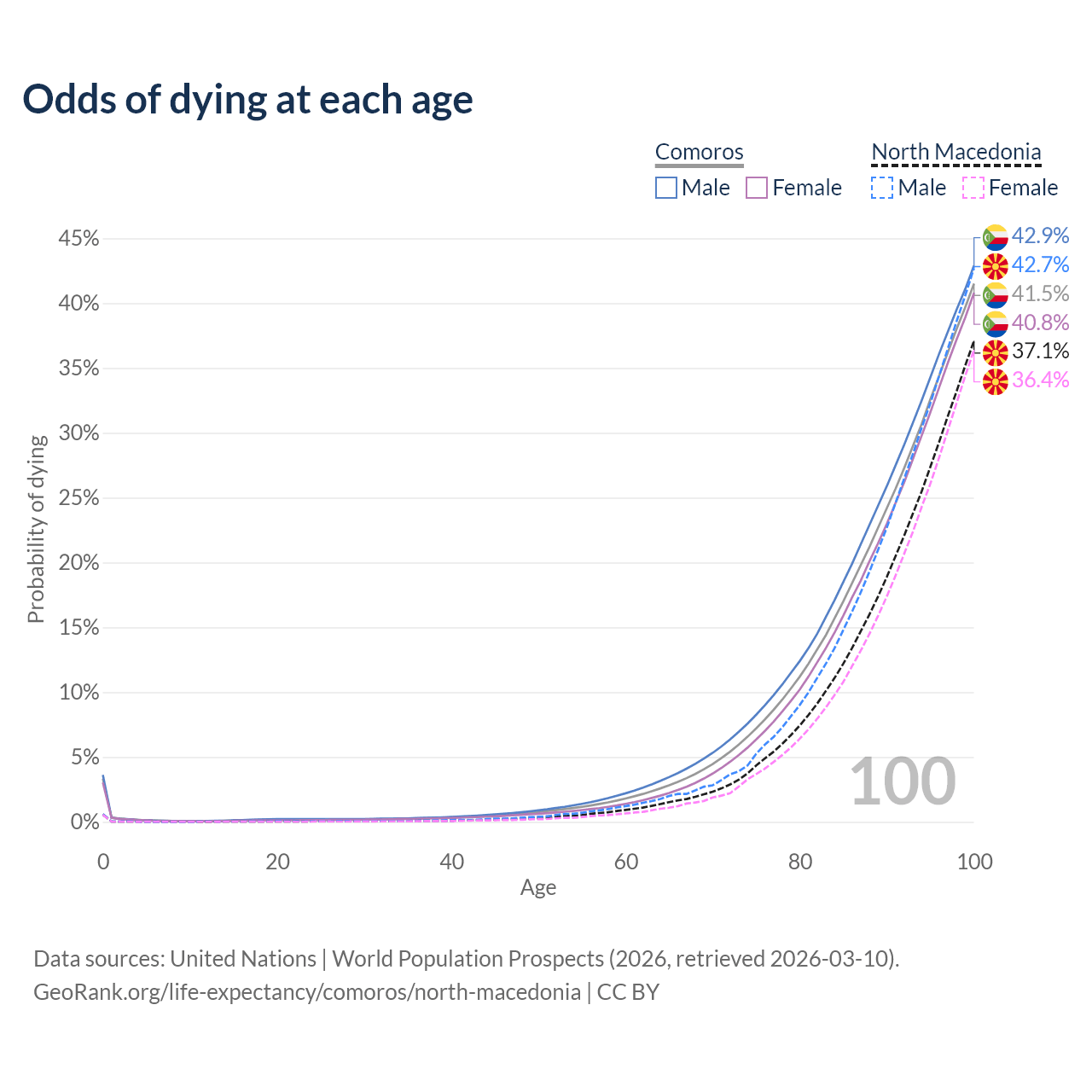This life expectancy calculator shows the odds of living to 100, 95, 90, and below based on current age for both males and females in Comoros and North Macedonia, along with mean and median age of death. The calculations are based on the 2026 life tables (actuarial tables) from the UN World Population Prospects.