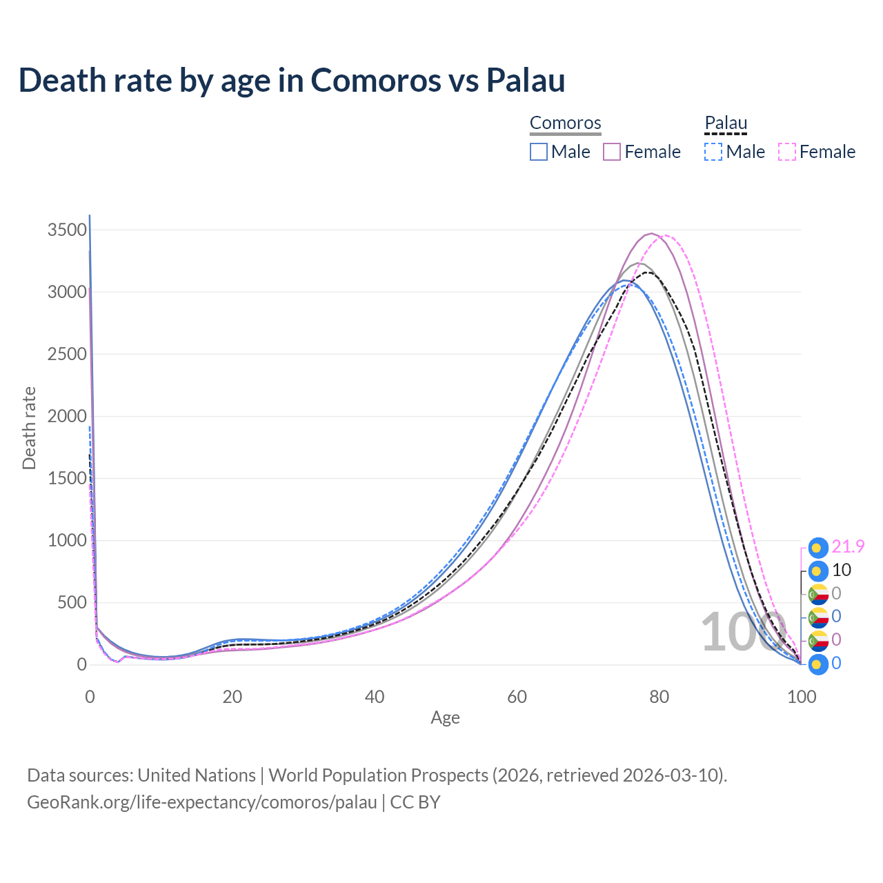 In Comoros, the most common age of death is 0, compared to 78 in Palau. The median age of death is 72.9 in Comoros and 73.8 in Palau, meaning only half of each cohort is expected to live past that age.
