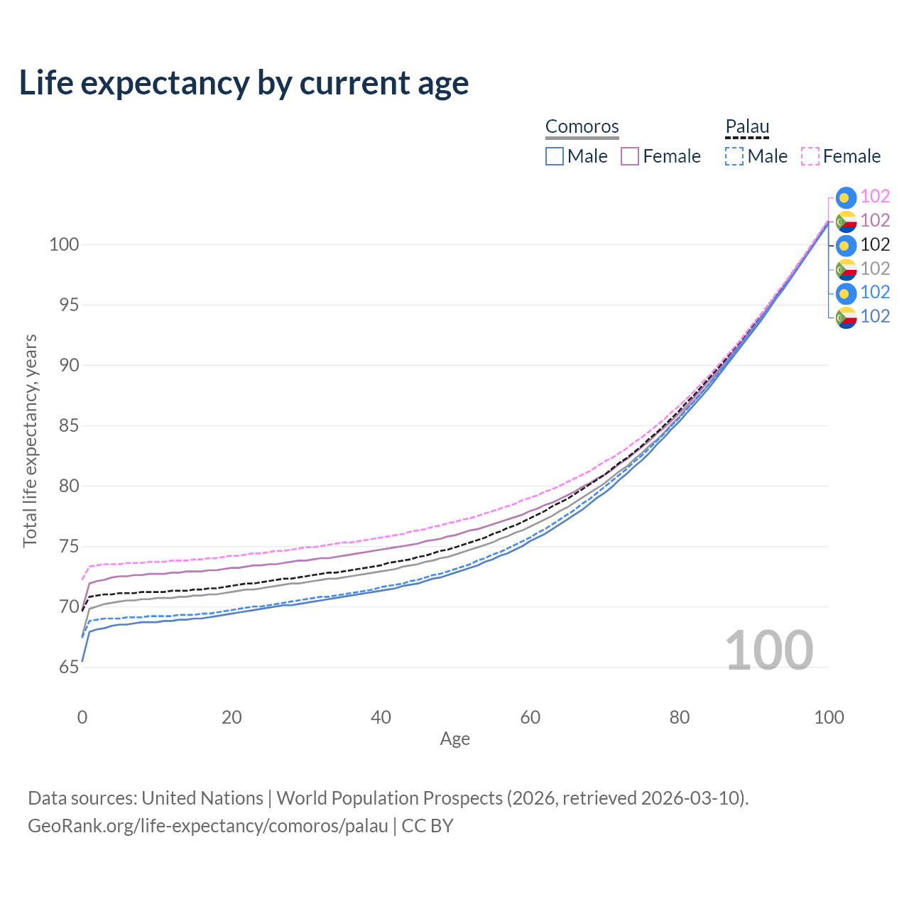 This life expectancy calculator shows the odds of living to 100, 95, 90, and below based on current age for both males and females in Comoros and Palau, along with mean and median age of death. The calculations are based on the 2026 life tables (actuarial tables) from the UN World Population Prospects.