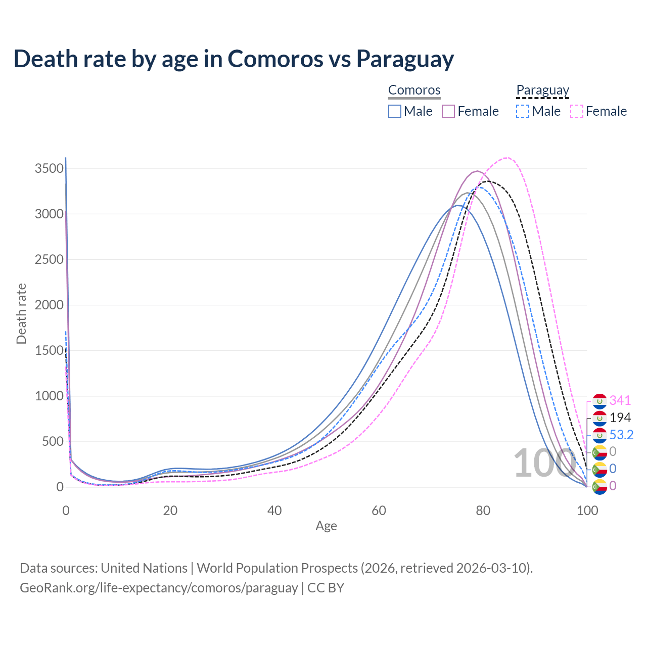 In Comoros, the most common age of death is 0, compared to 81 in Paraguay. The median age of death is 72.9 in Comoros and 78.4 in Paraguay, meaning only half of each cohort is expected to live past that age.