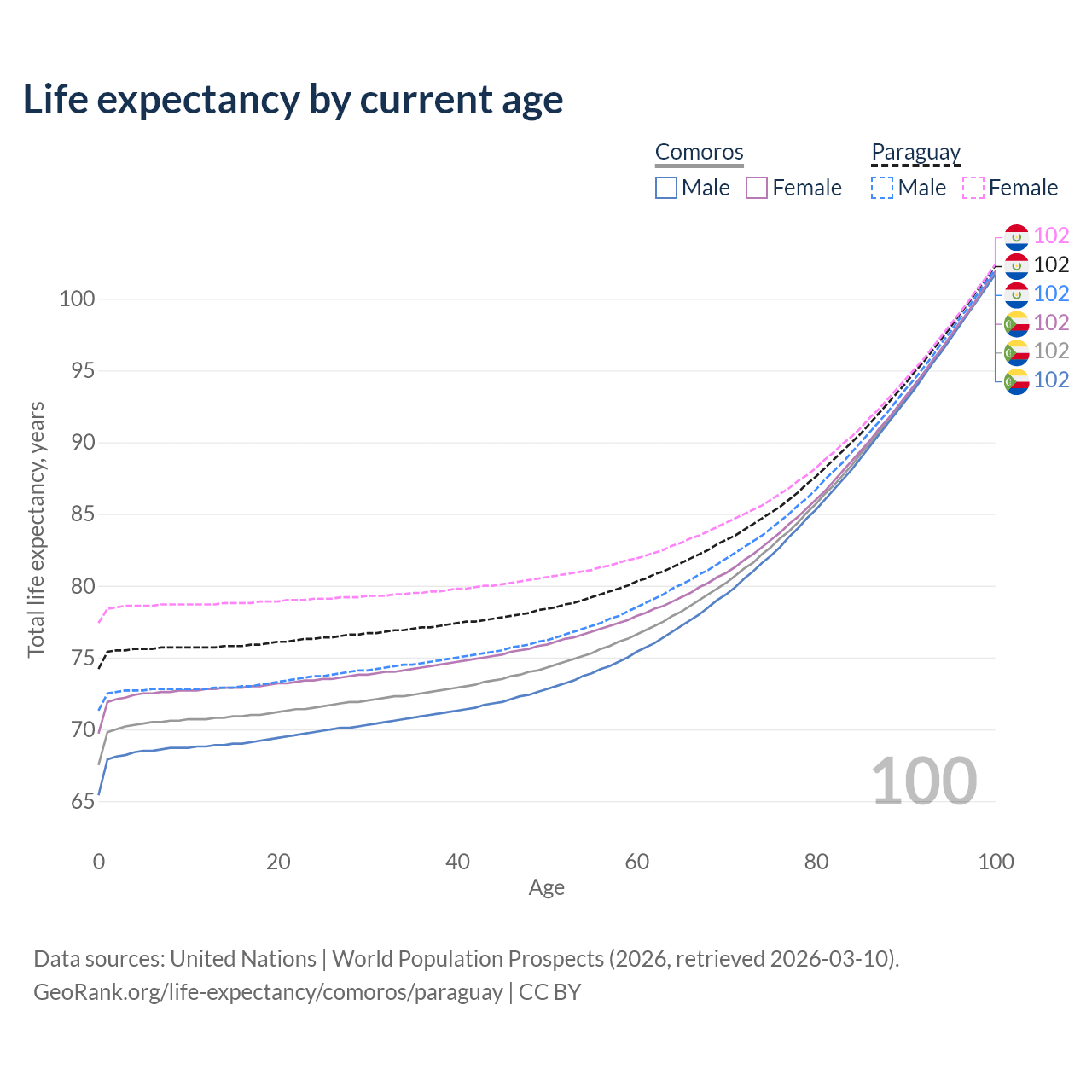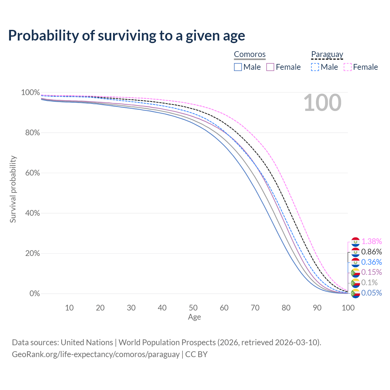 This life expectancy calculator shows the odds of living to 100, 95, 90, and below based on current age for both males and females in Comoros and Paraguay, along with mean and median age of death. The calculations are based on the 2026 life tables (actuarial tables) from the UN World Population Prospects.