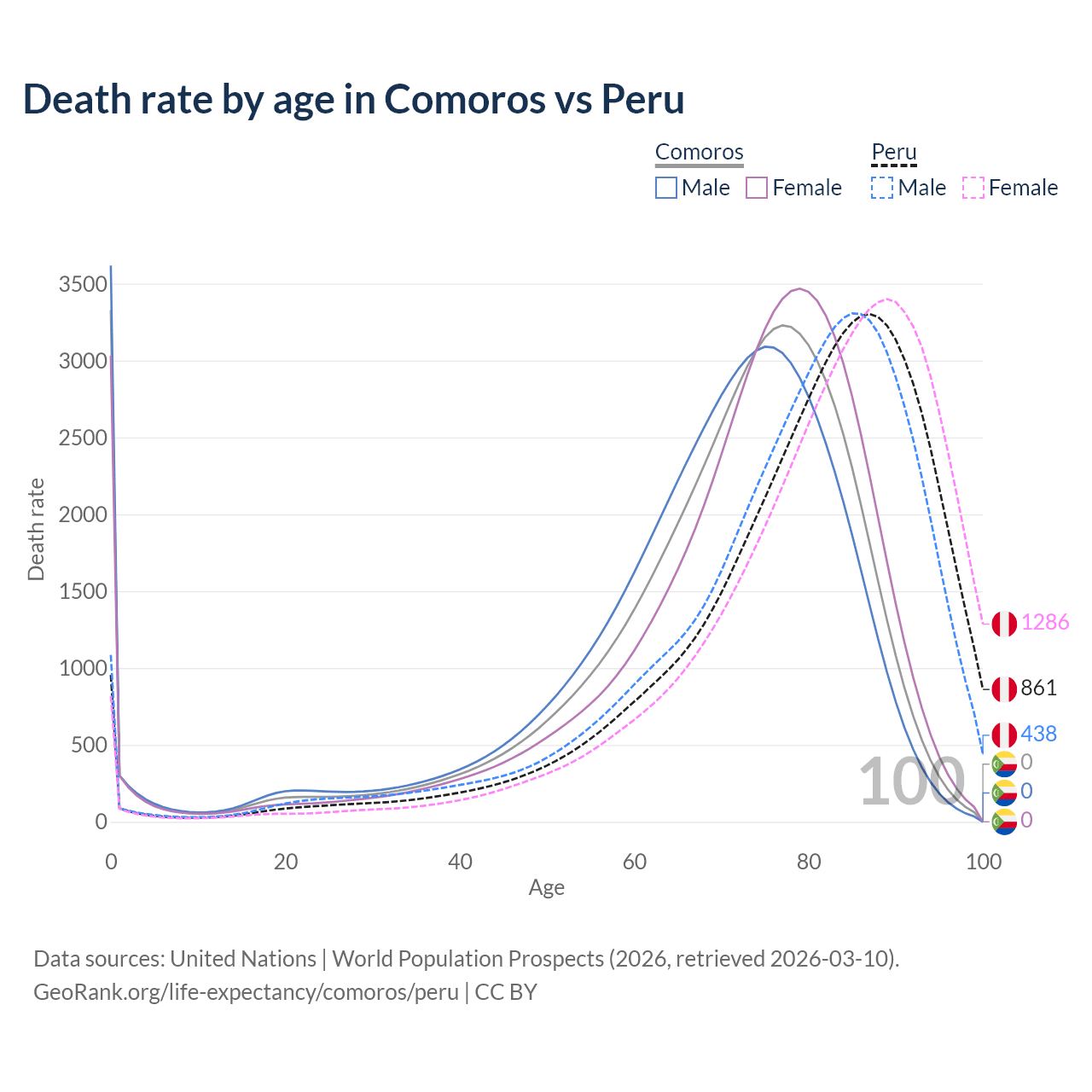 In Comoros, the most common age of death is 0, compared to 87 in Peru. The median age of death is 72.9 in Comoros and 82.4 in Peru, meaning only half of each cohort is expected to live past that age.