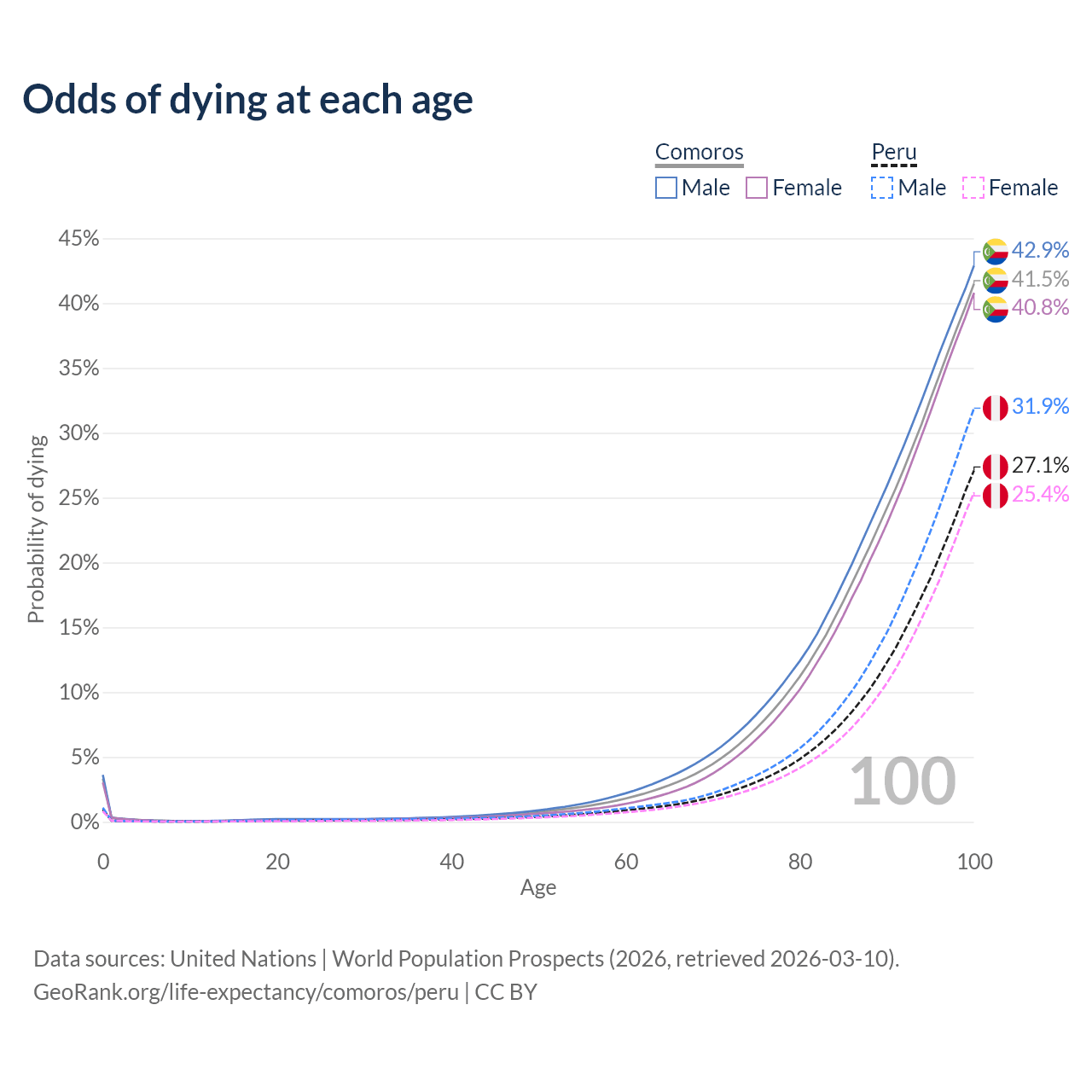 This life expectancy calculator shows the odds of living to 100, 95, 90, and below based on current age for both males and females in Comoros and Peru, along with mean and median age of death. The calculations are based on the 2026 life tables (actuarial tables) from the UN World Population Prospects.