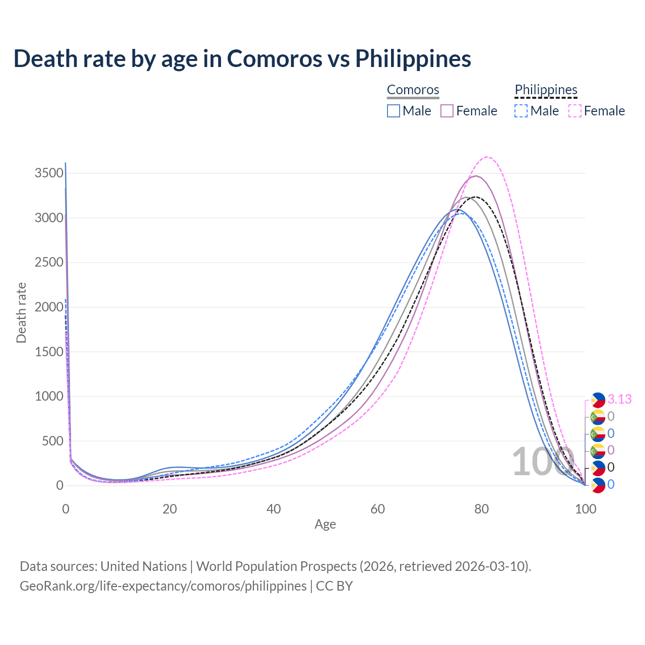 In Comoros, the most common age of death is 0, compared to 79 in the Philippines. The median age of death is 72.9 in Comoros and 74.6 in the Philippines, meaning only half of each cohort is expected to live past that age.