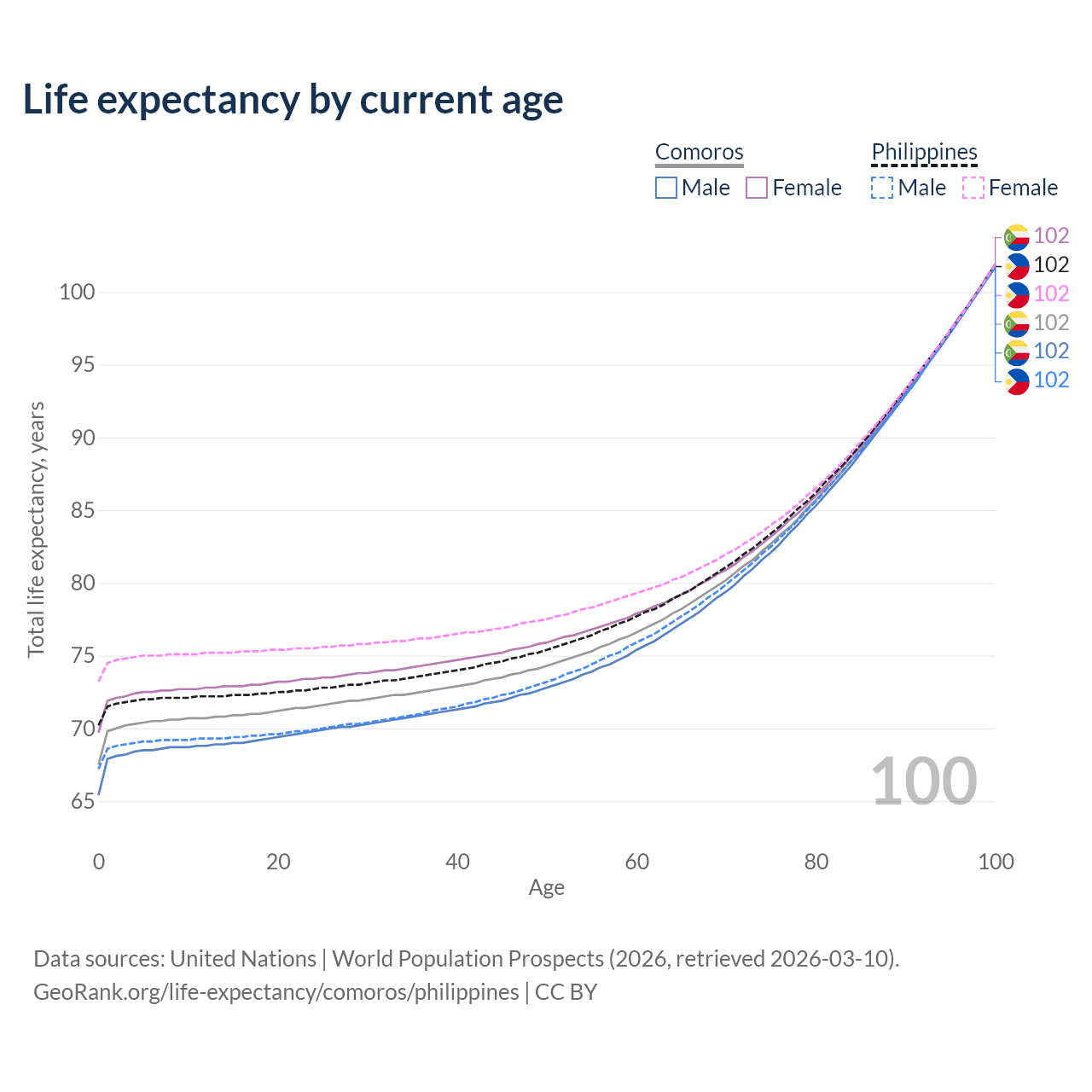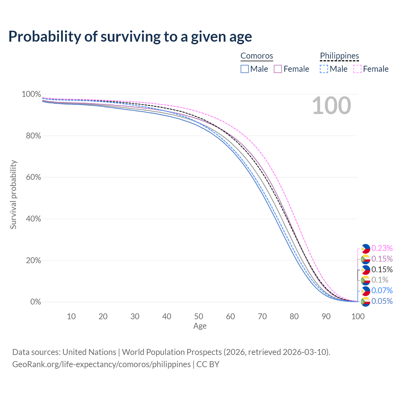 This life expectancy calculator shows the odds of living to 100, 95, 90, and below based on current age for both males and females in Comoros and the Philippines, along with mean and median age of death. The calculations are based on the 2026 life tables (actuarial tables) from the UN World Population Prospects.