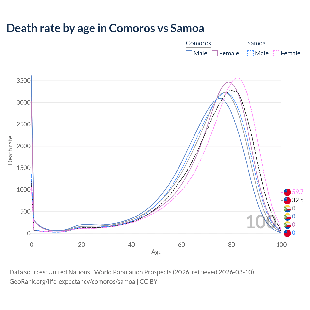 In Comoros, the most common age of death is 0, compared to 80 in Samoa. The median age of death is 72.9 in Comoros and 75.9 in Samoa, meaning only half of each cohort is expected to live past that age.