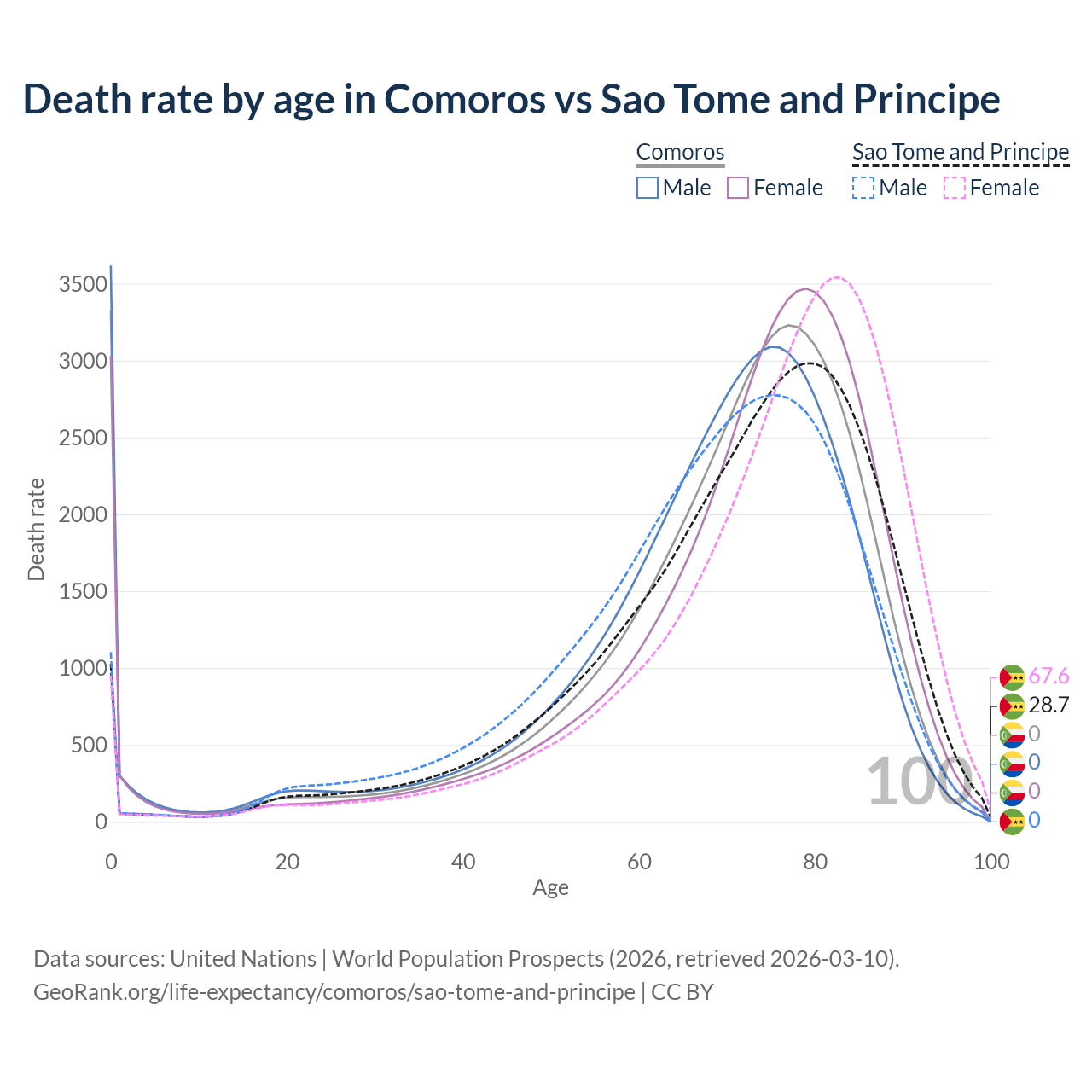 In Comoros, the most common age of death is 0, compared to 79 in Sao Tome and Principe. The median age of death is 72.9 in Comoros and 74.1 in Sao Tome and Principe, meaning only half of each cohort is expected to live past that age.