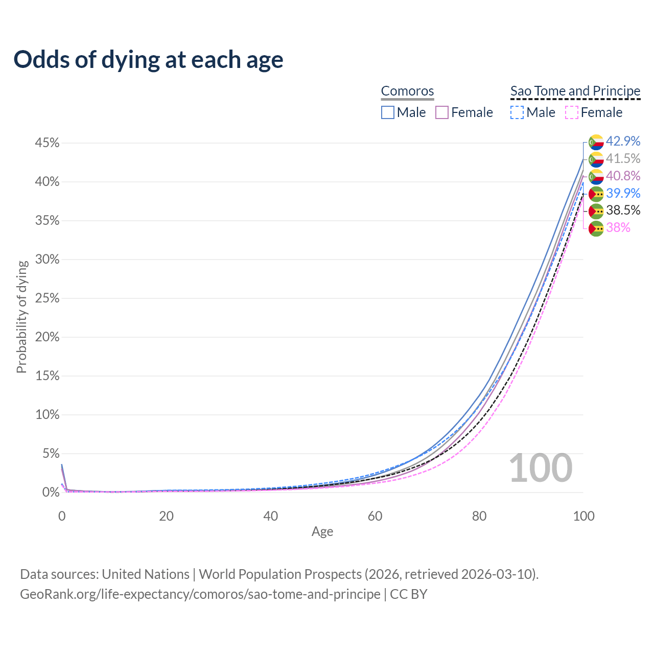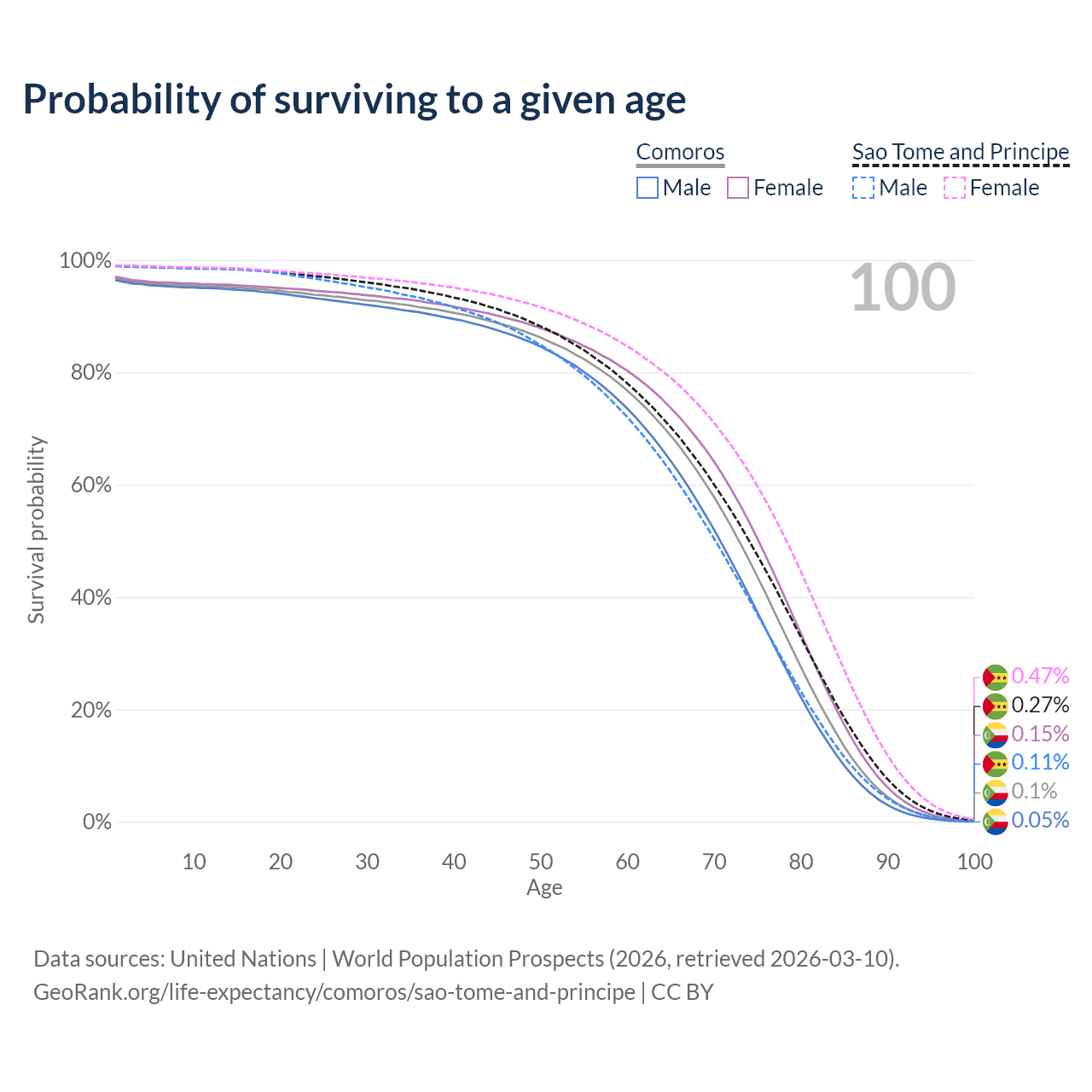 This life expectancy calculator shows the odds of living to 100, 95, 90, and below based on current age for both males and females in Comoros and Sao Tome and Principe, along with mean and median age of death. The calculations are based on the 2026 life tables (actuarial tables) from the UN World Population Prospects.