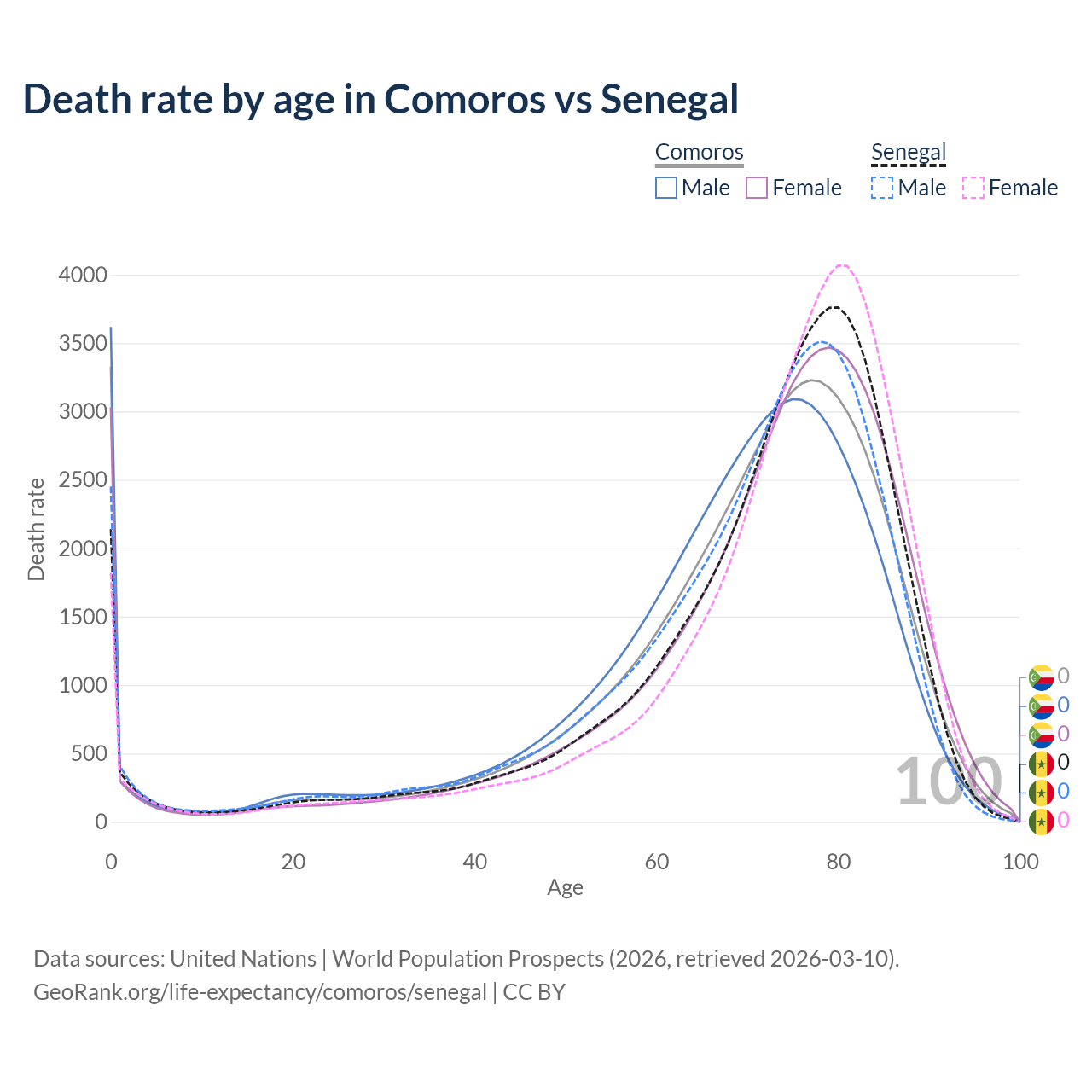 In Comoros, the most common age of death is 0, compared to 80 in Senegal. The median age of death is 72.9 in Comoros and 75 in Senegal, meaning only half of each cohort is expected to live past that age.