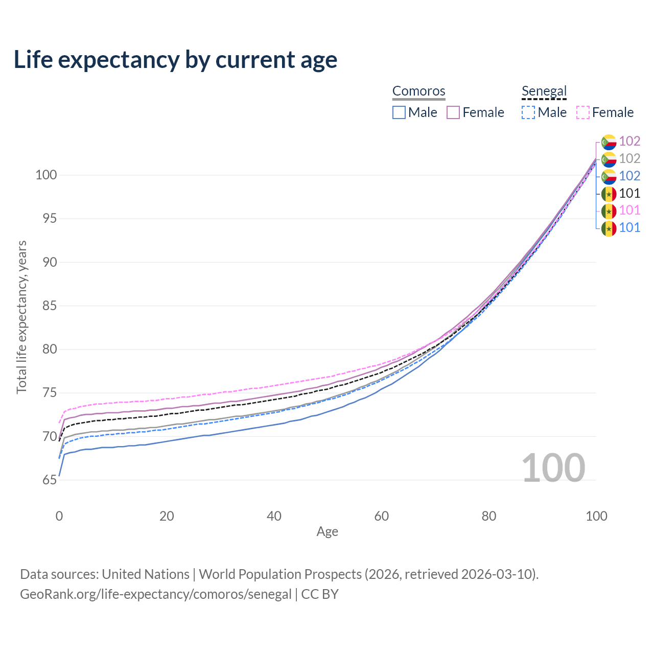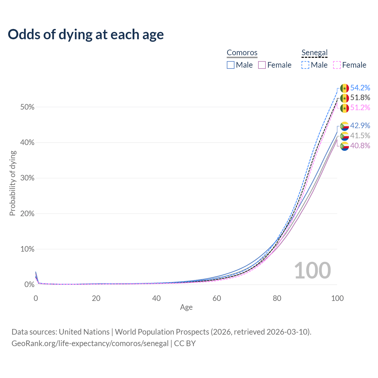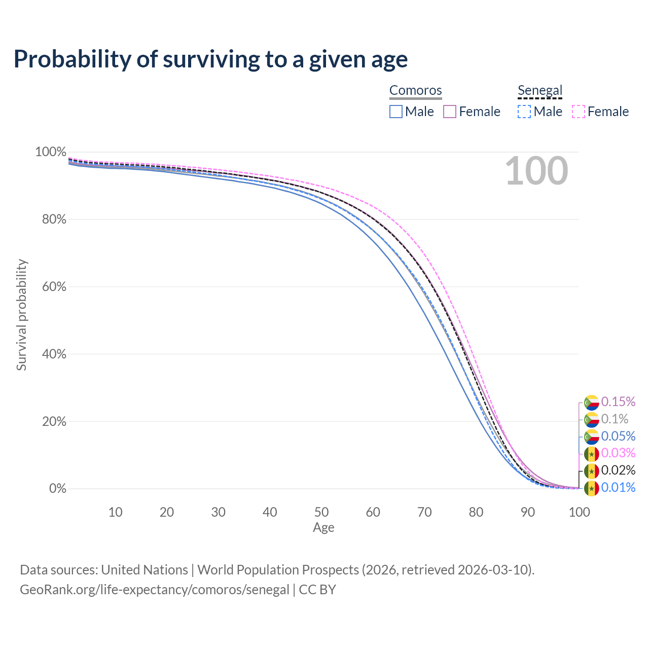 This life expectancy calculator shows the odds of living to 100, 95, 90, and below based on current age for both males and females in Comoros and Senegal, along with mean and median age of death. The calculations are based on the 2026 life tables (actuarial tables) from the UN World Population Prospects.