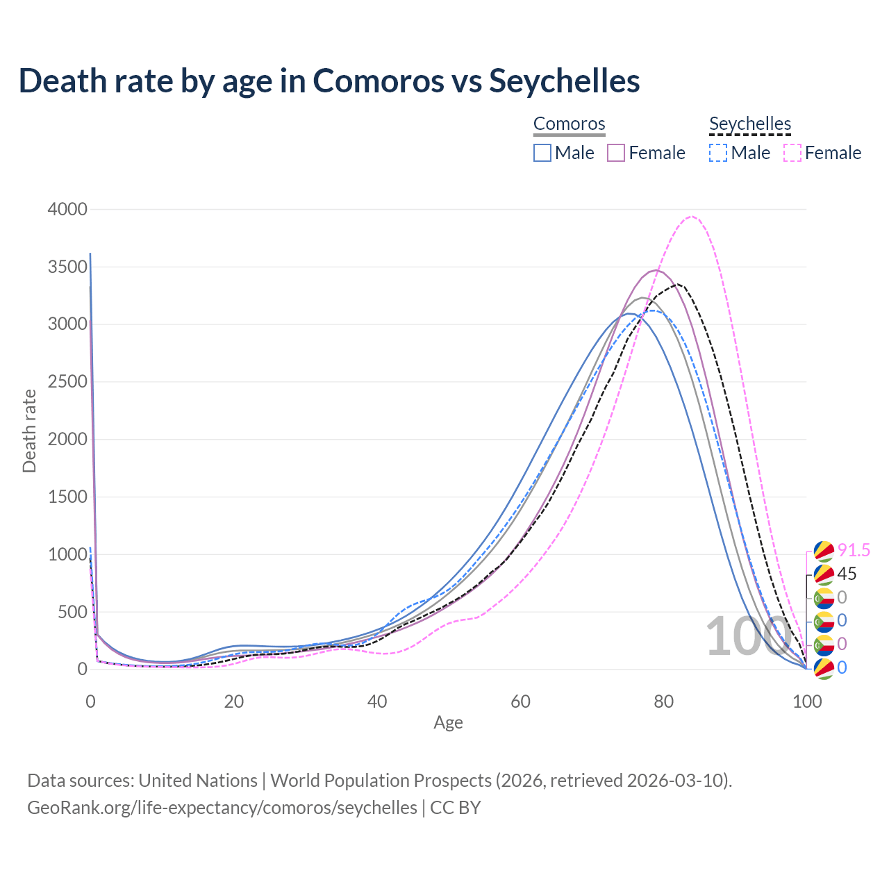 In Comoros, the most common age of death is 0, compared to 82 in the Seychelles. The median age of death is 72.9 in Comoros and 77 in the Seychelles, meaning only half of each cohort is expected to live past that age.