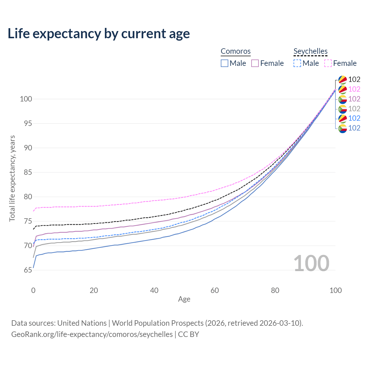 This life expectancy calculator shows the odds of living to 100, 95, 90, and below based on current age for both males and females in Comoros and the Seychelles, along with mean and median age of death. The calculations are based on the 2026 life tables (actuarial tables) from the UN World Population Prospects.