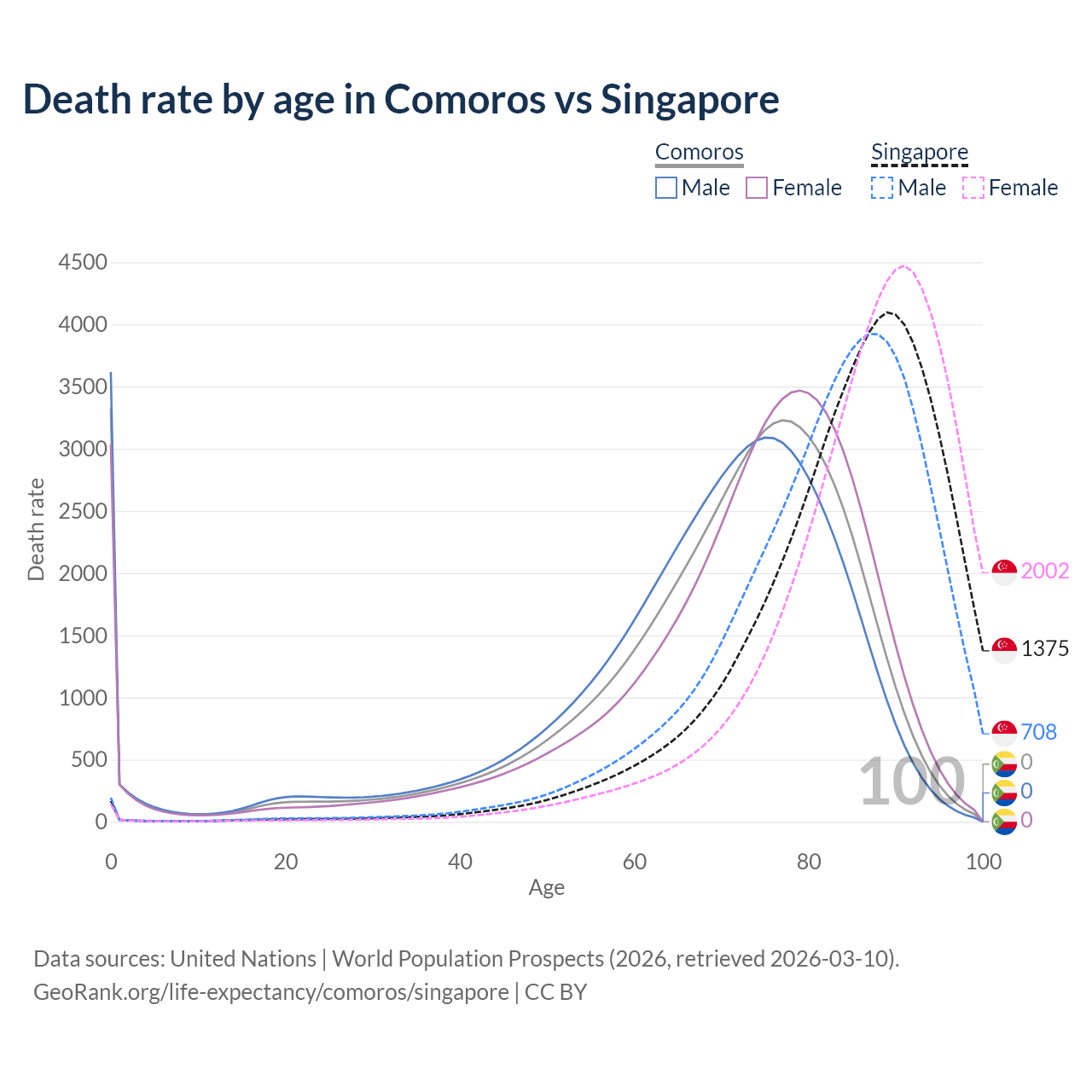 In Comoros, the most common age of death is 0, compared to 89 in Singapore. The median age of death is 72.9 in Comoros and 86.5 in Singapore, meaning only half of each cohort is expected to live past that age.