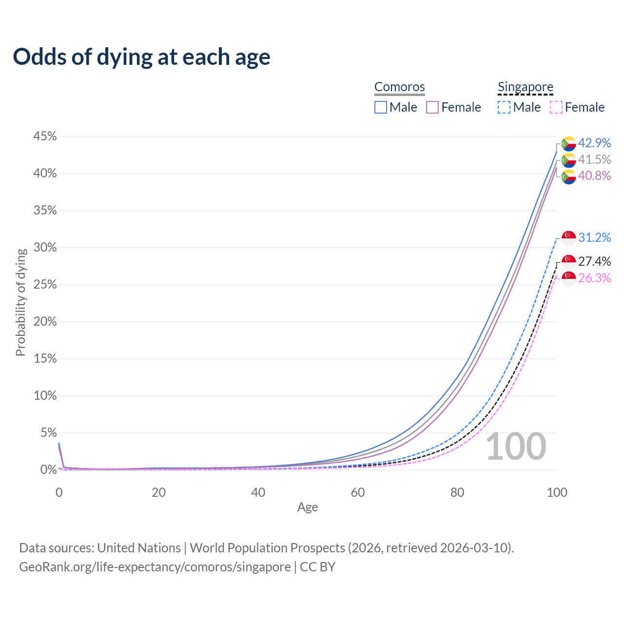 This life expectancy calculator shows the odds of living to 100, 95, 90, and below based on current age for both males and females in Comoros and Singapore, along with mean and median age of death. The calculations are based on the 2026 life tables (actuarial tables) from the UN World Population Prospects.