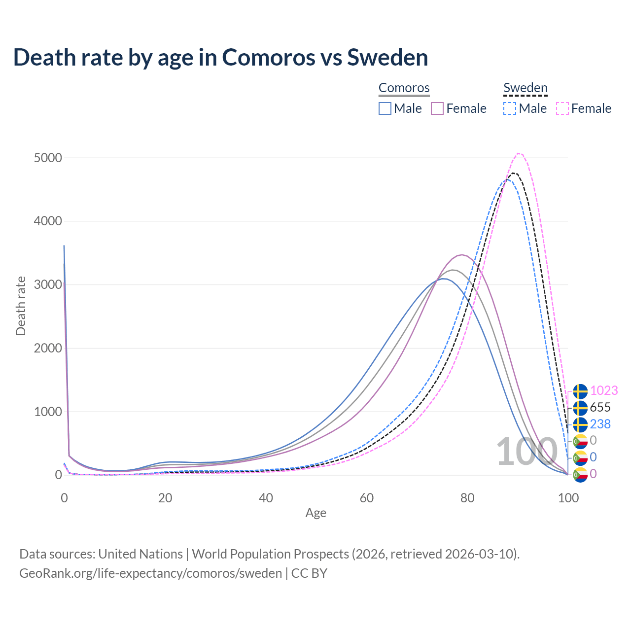 In Comoros, the most common age of death is 0, compared to 89 in Sweden. The median age of death is 72.9 in Comoros and 86.5 in Sweden, meaning only half of each cohort is expected to live past that age.